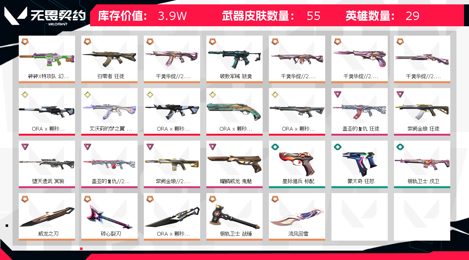【皮肤资产价值】39050 【使用R点】1090 【英雄数量】28 【皮肤数量】54 【卡面数量】120 【喷漆数量】93 【挂件数量】86 【拥有套装】ORA-x-颗秒套装(ORA-x-颗秒-狂徒,ORA-x-颗秒-幻影,ORA-x-颗秒-冥驹,ORA-x-颗秒-正义,ORA-x-颗秒-军刀)千灵华绽//2.0套装(千灵华绽//2.0-狂徒,千灵华绽//2.0-战神,千灵华绽//2.0-莽侠,千灵华绽//2.0-鬼魅,流风回雪)耀鳞威龙套装(耀鳞威龙-狂徒,耀鳞威龙-鬼魅,威龙之刃) 【拥有近战武器】碎心裂刃,钢轨卫士-战锤, 【拥有步枪】砰砰X特攻队-幻影,归零者-狂徒,艾沃莉的梦之翼-狂徒,紫阙金琅//2.0-幻影,紫阙金琅-狂徒,盖亚的复仇-狂徒,幻心猎手-狂徒,钢轨卫士-戍卫,钢轨卫士-狂徒,诛心猎手-獠犬,甜心猎手-戍卫,甜心猎手-幻影,战术小伙伴-獠犬,战术小伙伴-幻影, 【拥有狙击枪】堕天遗武-冥驹,诛心猎手-冥驹,甜心猎手-莽侠,光导纤维-飞将, 【拥有机枪】盖亚的复仇//2.0-战神,诛心猎手-奥丁,战术小伙伴-奥丁, 【拥有冲锋枪】破败军械-骇灵,甜心猎手-蜂刺,战术小伙伴-蜂刺,光导纤维-骇灵, 【拥有霰弹枪】 【拥有手枪】幻心猎手-鬼魅,星际猎兵-标配,日耀风暴-正义,诡秘蛇影-鬼魅,钢轨卫士-短炮,钢轨卫士-狂怒,诛心猎手-正义,甜心猎手-短炮,天才少女-短炮,星云暗涌-鬼魅,纳米-正义,复古浪潮-正义,光导纤维-鬼魅,光导纤维-标配, 【稀有挂件】V25第六幕黄金挂饰,糖饼先生挂饰,千灵华绽20挂饰,V25第三幕白银挂饰,云开见日挂饰,第九季青铜挂饰,终章猫猫木乃伊挂饰,迷你浓缩挂饰,袖珍捷风挂饰,第八季青铜挂饰,传世莲华挂饰,无畏契约GO卷芮娜挂饰,好运福爪挂饰,瞄这里挂饰,改变者全球冠军赛奖杯挂饰,幸运中国结挂饰, 【卡面信息】糖饼惊喜卡面,千灵华绽20卡面,万圣夜卡面,情人节猎枭卡面,超能偶像卡面,神射卡面,势不可挡捷风卡面,逆向独行卡面,耀鳞威龙卡面,Luie卡面,;威龙之刃,盖亚的复仇 狂徒,紫阙金琅 狂徒,堕天遗武 冥驹,