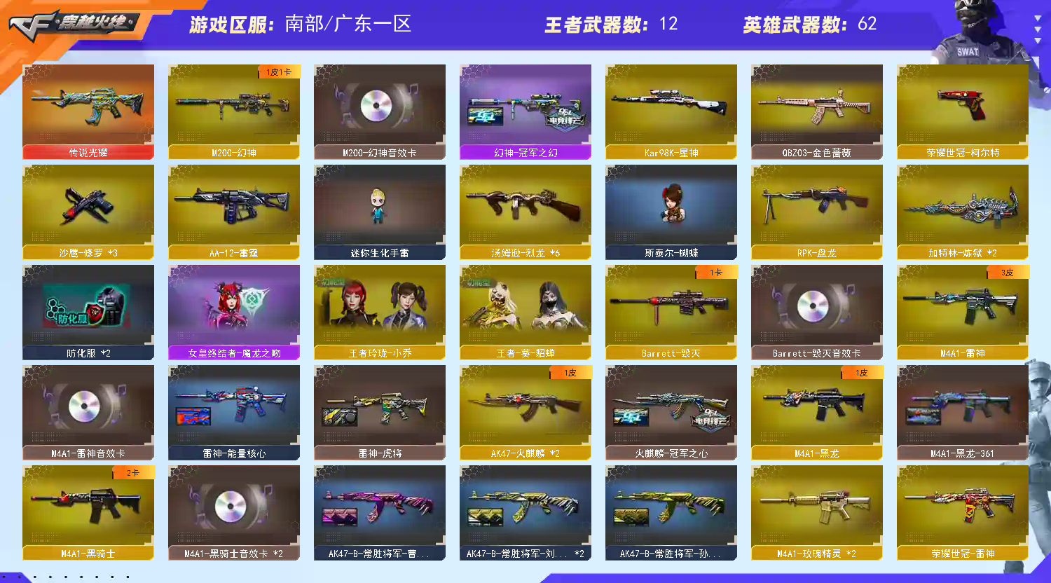 【亮点解析 幻神三件套 生化高配 】【m200幻神+音效卡+冠军之幻】【98k星神】【6烈龙 盘龙 炼狱*2 斯太尔蝴蝶 】【传说光耀】【qbz金色蔷薇】【hk417朱雀】【火麒麟+冠军之心】【黑龙】【雷神+卡】【黑骑士+卡】【毁灭+卡+cfs2018】 【武器:王者之心 王者之武 王者之戮 海王 荣耀世冠火麒麟 荣耀世冠雷神 天龙 】 【4手枪:修罗*3 荣耀世冠柯尔特 】 【14刀具:屠龙*6 擎天 麒麟刺 尼泊尔雷霆 王者之啸 王者之击 荣耀世冠龙啸 】 【雷套:雷霆雷 】 【小人枪:火麒麟绝迹 】 【音效卡:黑骑士音效卡 雷神音效卡 黑骑士音效卡 幻神音效卡 毁灭音效卡 】 【四防角色:王者葵貂蝉 王者玲珑小乔 职业经理 】;荣耀世冠-柯尔特,RPK-盘龙,QBZ03-金色蔷薇,M200-幻神,Kar98K-星神,