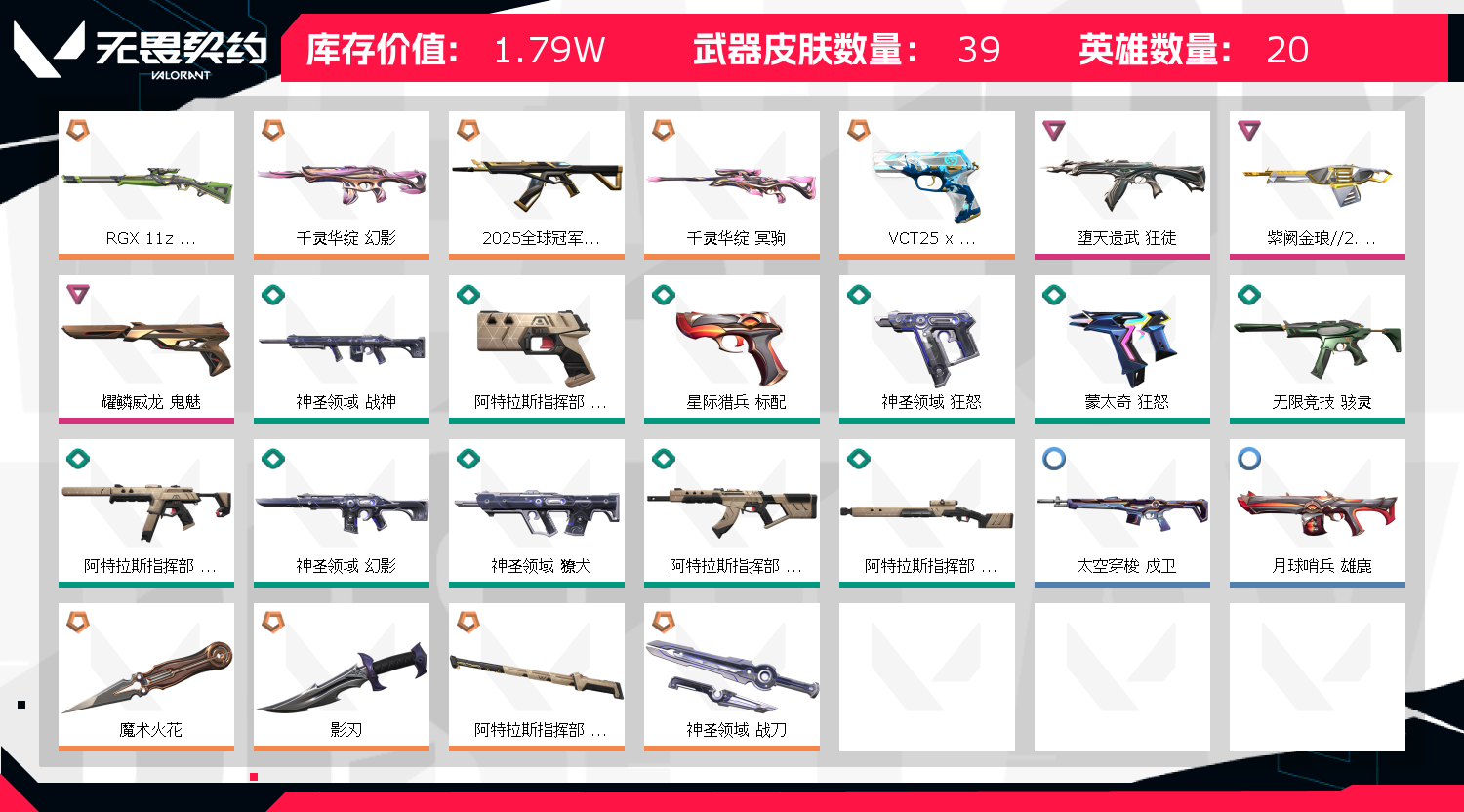 25冠军狂徒✨电工钳✨影刃✨弃王狂徒✨千灵幻影✨威龙鬼魅✨VCT标配✨千灵冥驹✨显卡莽侠✨紫金奥丁
