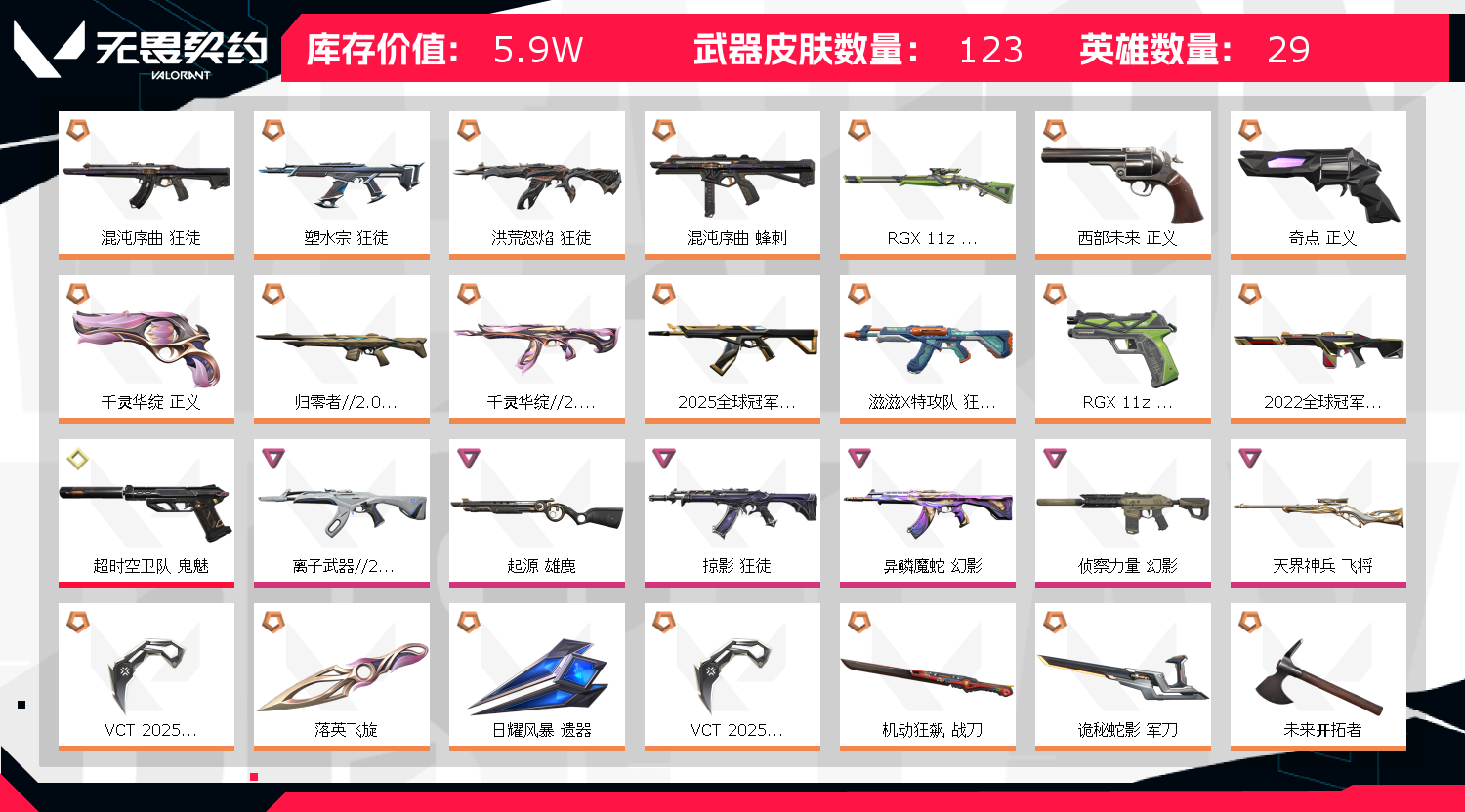 1;VCT 2025 爪刀,起源 雄鹿,洪荒怒焰 狂徒,掠影 狂徒,异鳞魔蛇 幻影,侦察力量 幻影,混沌序曲 狂徒,