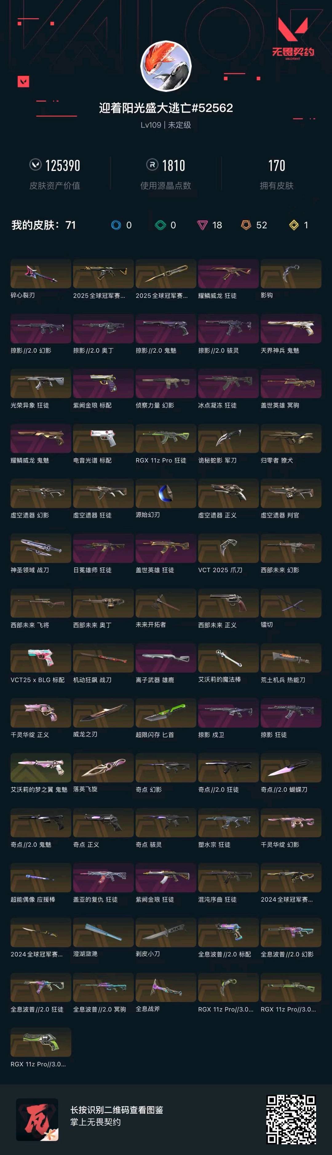 充了小1w,许多优质皮肤都有,欢迎来租;西部未来 奥丁,剥皮小刀,镭切,威龙之刃,VCT 2025 爪刀,归零者 獠犬,盖亚的复仇 狂徒,