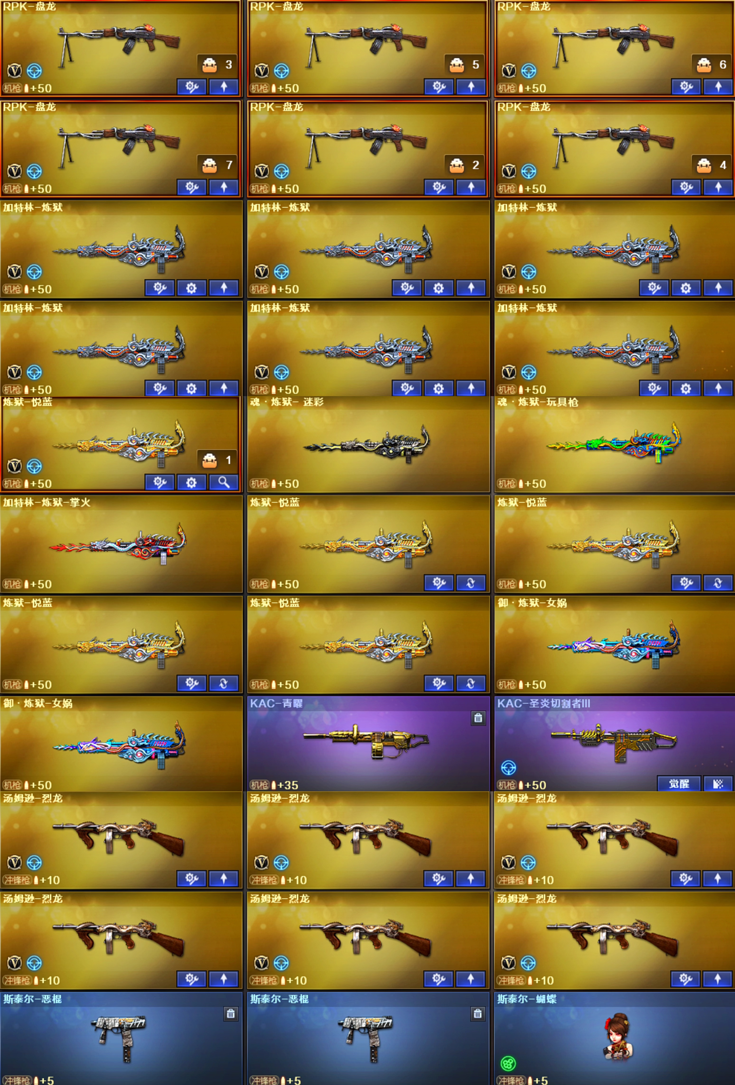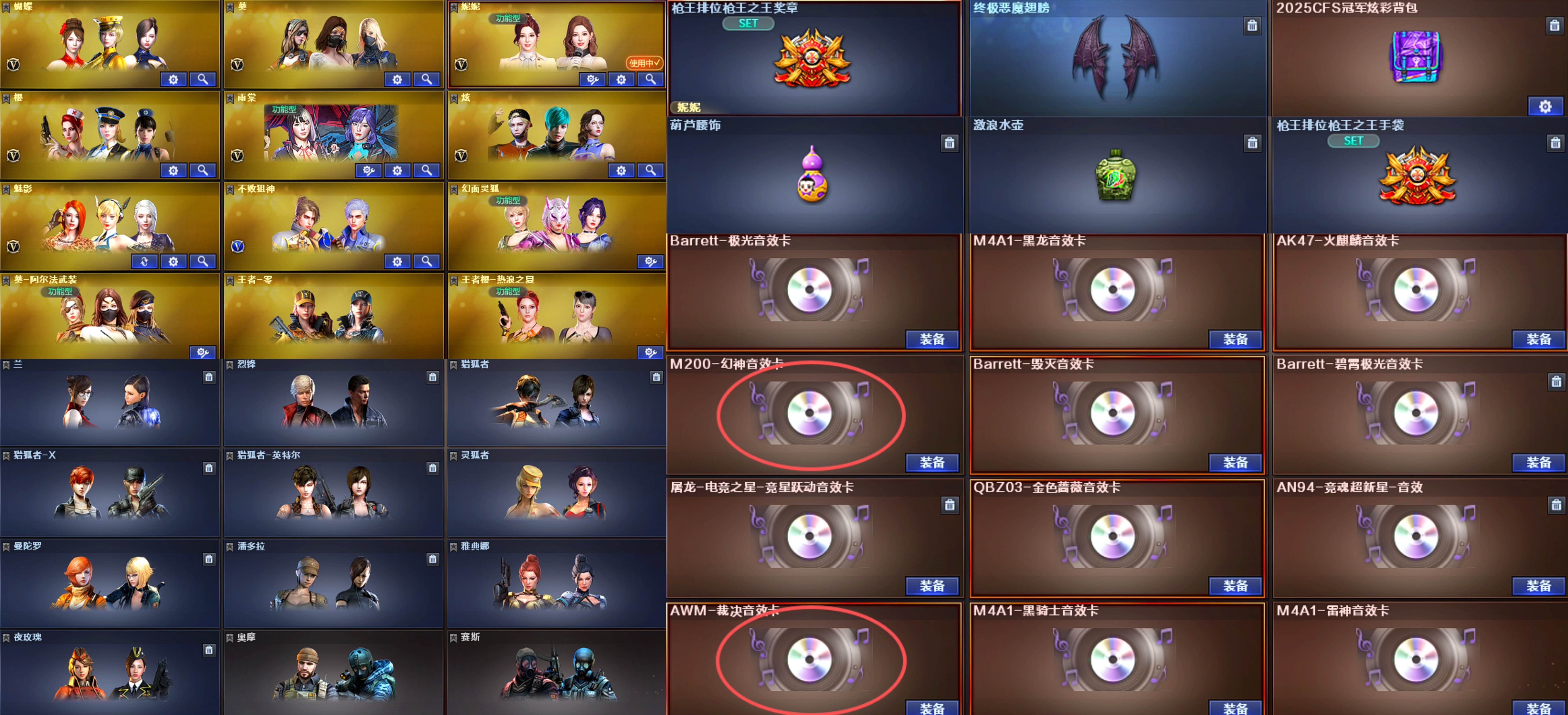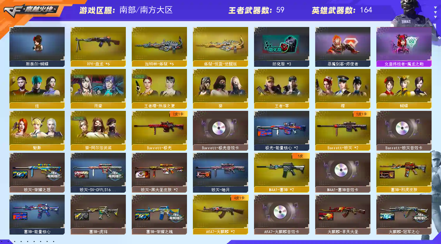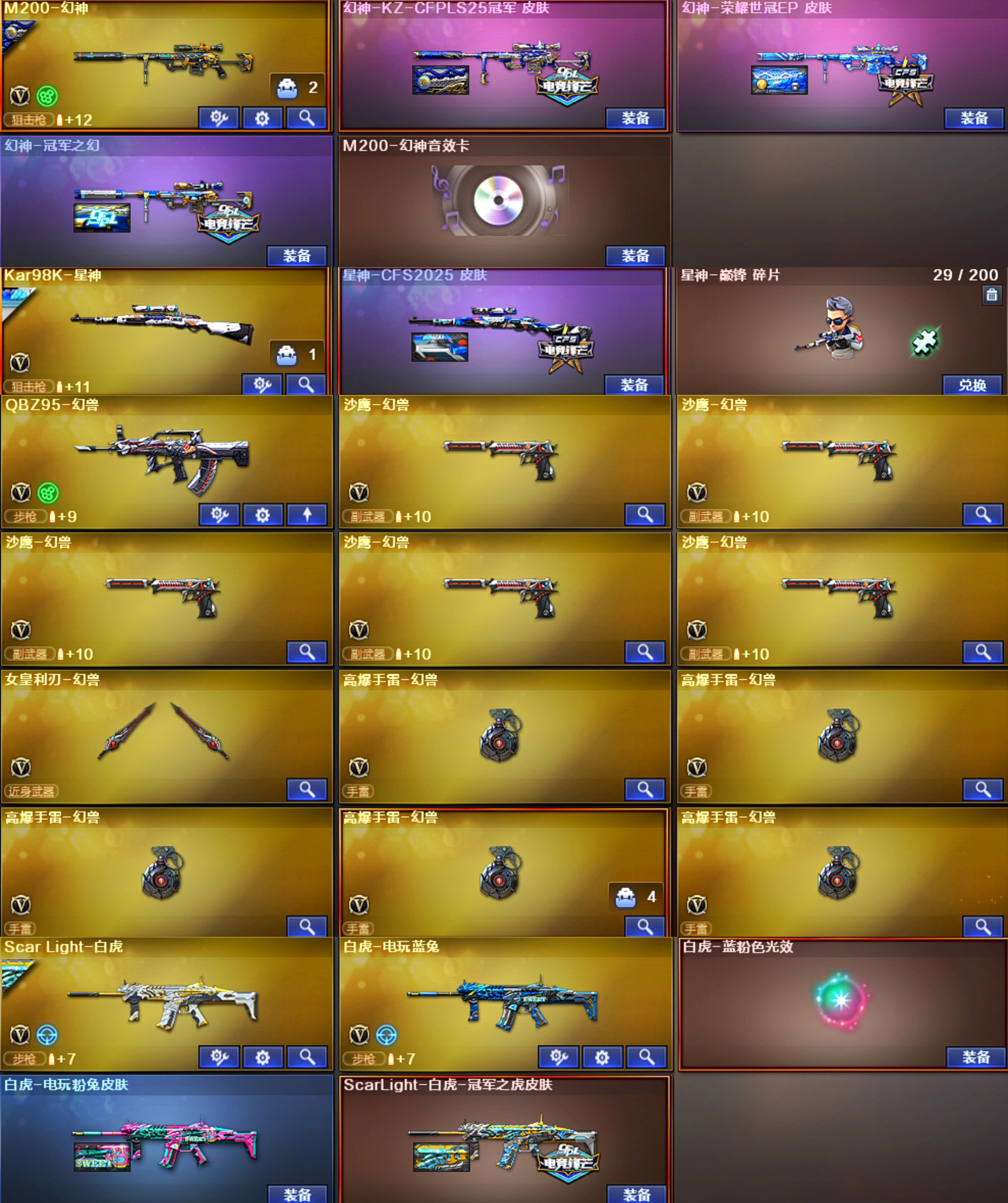 南部幻兽;USP-雷暴王者,妮妮,RPK-盘龙,QBZ03-金色蔷薇,M200-幻神,Scar Light-白虎,Kar98K-星神,