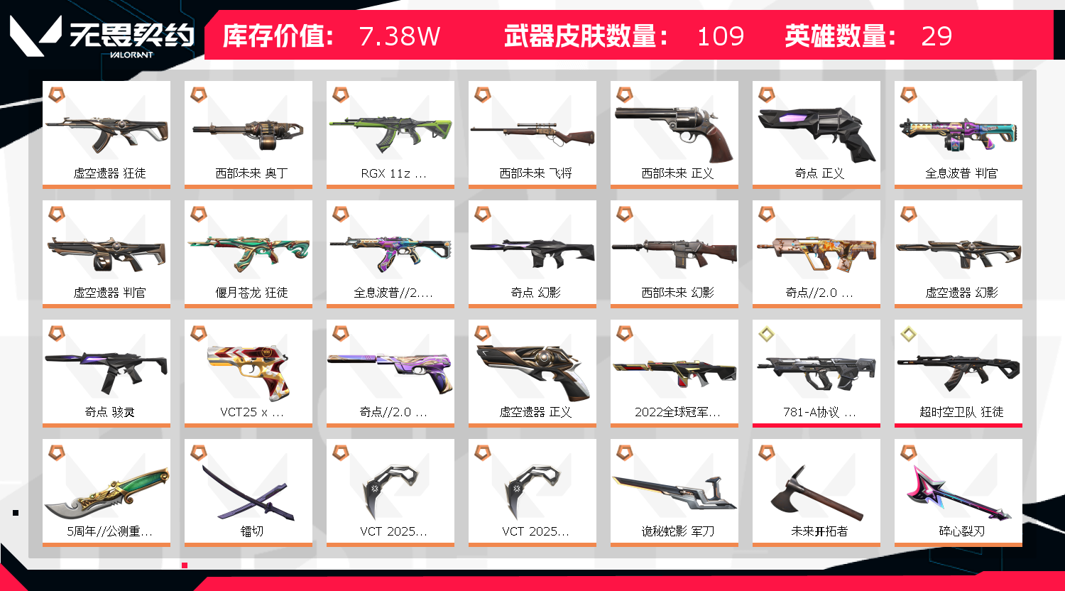 异地冻结秒结⚡重新登一下就行❤自动换手机令牌验证。炸鱼的老板饶了我,请各位老板不要挂机,挂机永久拉黑,租号是实名的,谢谢 小本买卖东拼西凑买的的皮肤。到时请勿再开游戏,多玩会本无所谓,但是系统会踢下线导致账号挂机禁赛会拉黑 使用外挂,恶意发言,在游戏内骗人等违规操作,拉黑全网公示,使用外挂脚本导致非正常游戏封号的,1.登陆界面稍等2分钟会上去老板不要着急,一次不行多来几次wegame界面要耐心等2分钟,登不上可换电脑重试 2.密令会自动输入如果一次不成功多来几次 3.到时请及时续租,系统会踢下线导致账号挂机,导致禁赛的一律拉黑 4.祝老板玩的愉快,喜欢可以收藏关注,请及时续租不要挂机,导致禁赛的一律拉黑;西部未来 奥丁,5周年//公测重制版 苍龙之刃,镭切,VCT 2025 爪刀,天界神兵//2.0 幻影,虚空遗器 狂徒,紫阙金琅 狂徒,