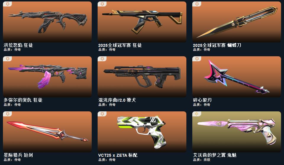wegame无畏契约★碎心裂刃,星际猎兵 短剑,2025全球冠军赛 蝴蝶刀,幻心猎手 鬼魅,甜心猎手 蜂刺,甜心猎手 幻影,星际猎兵 判官,诛心猎手 冥驹,诛心猎手 奥丁