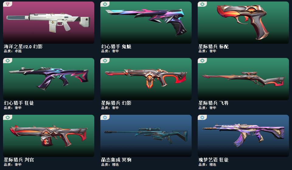 wegame无畏契约★武器皮肤数量:34,碎心裂刃,星际猎兵 短剑,2025全球冠军赛 蝴蝶刀,幻心猎手 鬼魅,甜心猎手 蜂刺,甜心猎手 幻影,星际猎兵 判官,诛心猎手 冥驹,诛心猎手 奥丁
