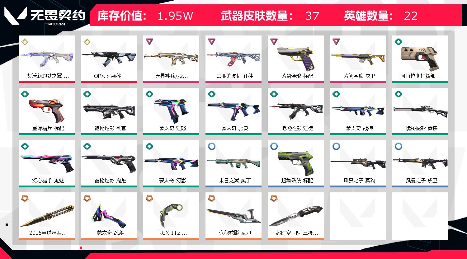 冻结三分钟内解除,短信通知重新上即可!喜欢收藏不迷路、游戏异常进小黑屋、时间不够请提前续租或者不要开局 【英雄】:炼狱,暮蝶,钛狐,壹决,捷风,幽影,不死鸟,贤者,猎枭,零,芮娜,尚勃勒,霓虹,夜露,黑梦 【近战武器】:近战武器-2025全球冠军赛 蝴蝶刀,近战武器-超时空卫队 三棱军刺,近战武器-RGX 11z Pro//3.0 爪刀,近战武器-诡秘蛇影 军刀 【狂徒】:狂徒-艾沃莉的梦之翼,狂徒-ORA x 颗秒,狂徒-盖亚的复仇,狂徒-诡秘蛇影 【幻影】:幻影-天界神兵//2.0,幻影-末日之翼 【戍卫】:戍卫-紫阙金琅,戍卫-折光棱晶 【飞将】:飞将-末日之翼 【莽侠】:莽侠-诡秘蛇影 【奥丁】:奥丁-末日之翼 【判官】:判官-诡秘蛇影 【蜂刺】:蜂刺-折光棱晶 【标配】:标配-紫阙金琅,标配-折光棱晶 【正义】:正义-传奇制造 【鬼魅】:鬼魅-诡秘蛇影 【短炮】:短炮-末日之翼 【卡面】:无畏契约GO!一卷:芮娜 卡面,无畏契约GO!第卷:零 卡面,代号红色 卡面,新兵报到 卡面,V契约 卡面,无畏契约 卡面 【喷漆】:买装还是存钱 喷漆,胜利属于无畏契约 喷漆,GLHF 喷漆,无畏契约 喷漆 【挂饰】:天外飞客 挂饰,无畏契约 纪念币 挂饰;天界神兵//2.0 幻影,盖亚的复仇 狂徒,紫阙金琅 标配,