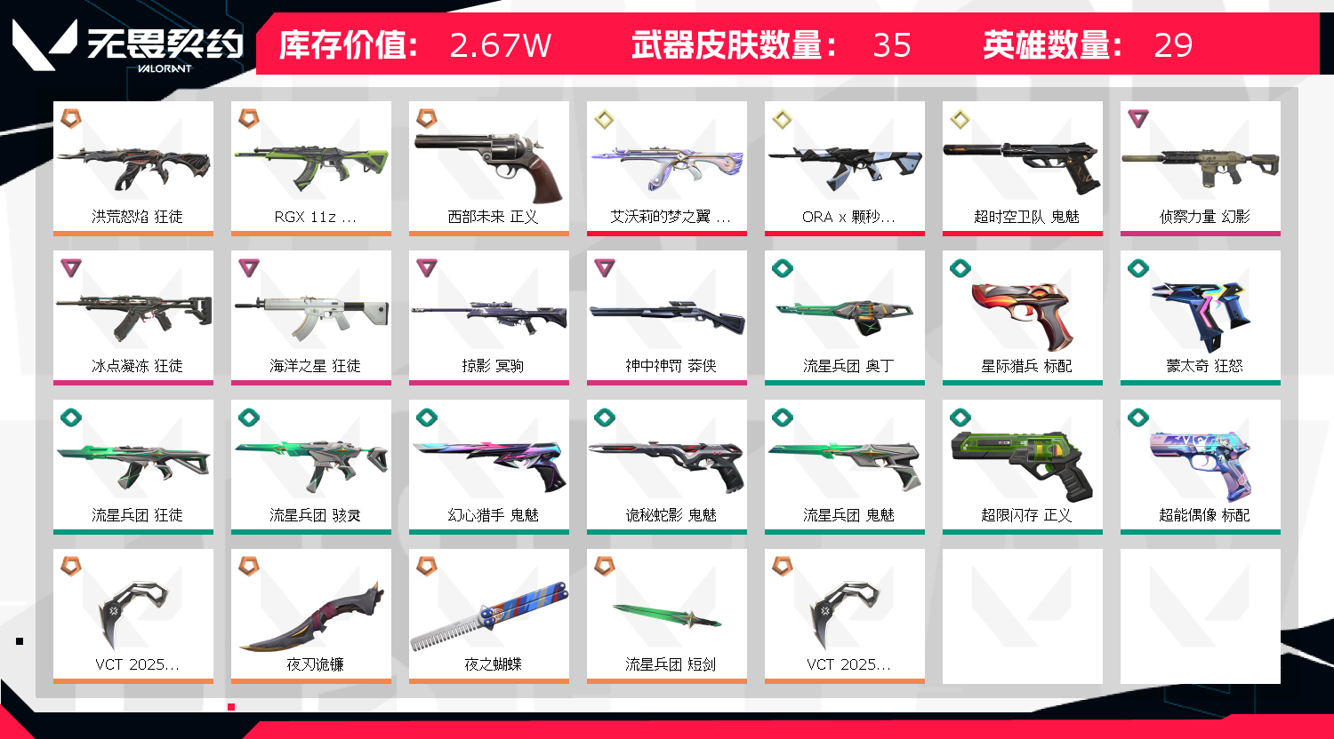 33皮/可排/全英雄/VCT爪刀 显卡狂徒 侦查幻影 颗秒狂徒;VCT 2025 爪刀,洪荒怒焰 狂徒,侦察力量 幻影,RGX 11z Pro 狂徒,西部未来 正义,