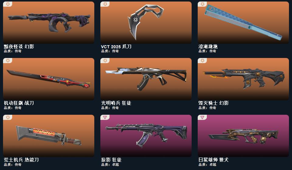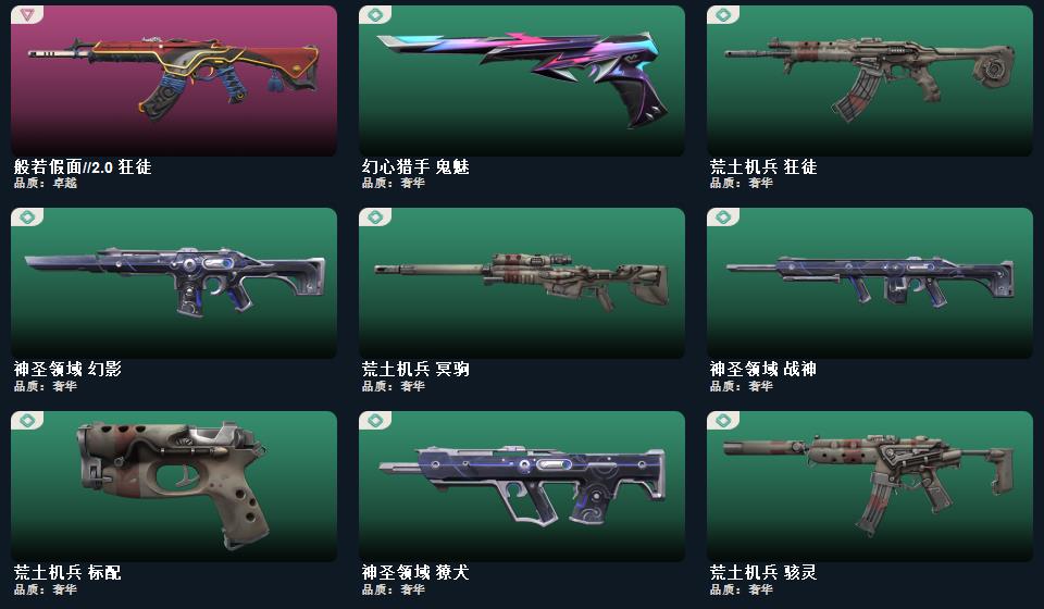 wegame无畏契约★幻心猎手 鬼魅,神圣领域 狂怒,月球哨兵 正义,荒土机兵 标配,逆冲蛮牛 狂怒,纳米打击 正义 神圣领域 獠犬,神圣领