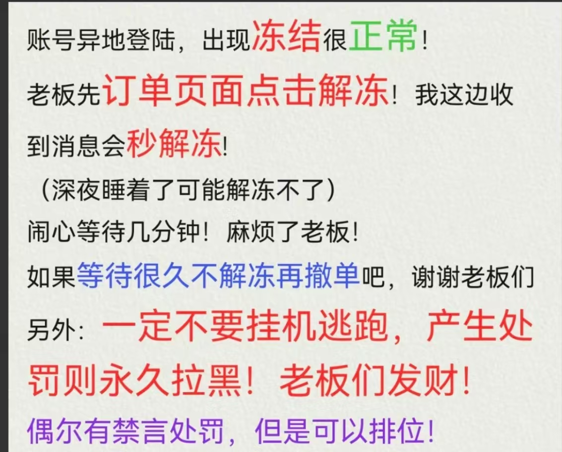 如遇异地冻结 请点击解除冻结! 点击解除冻结! 点击之后才能解除冻结! 后稍等几分钟即可正常登录,感谢等待 炸鱼请轻一点 禁止开挂,否则必报案追究 请勿挂机逃跑,谢谢配合。 账号退单问题请标注问题原因,我们会仔细查看;