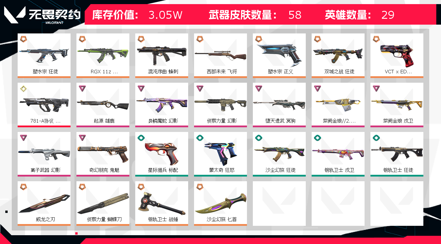 首页 > 租号大厅 > 无畏契约-wegame > wegame/wegame > T0毕业号🔥双城🔥塑水宗🔥侦察幻影🔥显卡 侦察蝴蝶刀 威龙之刃 塑水正义 朋克鬼魅
