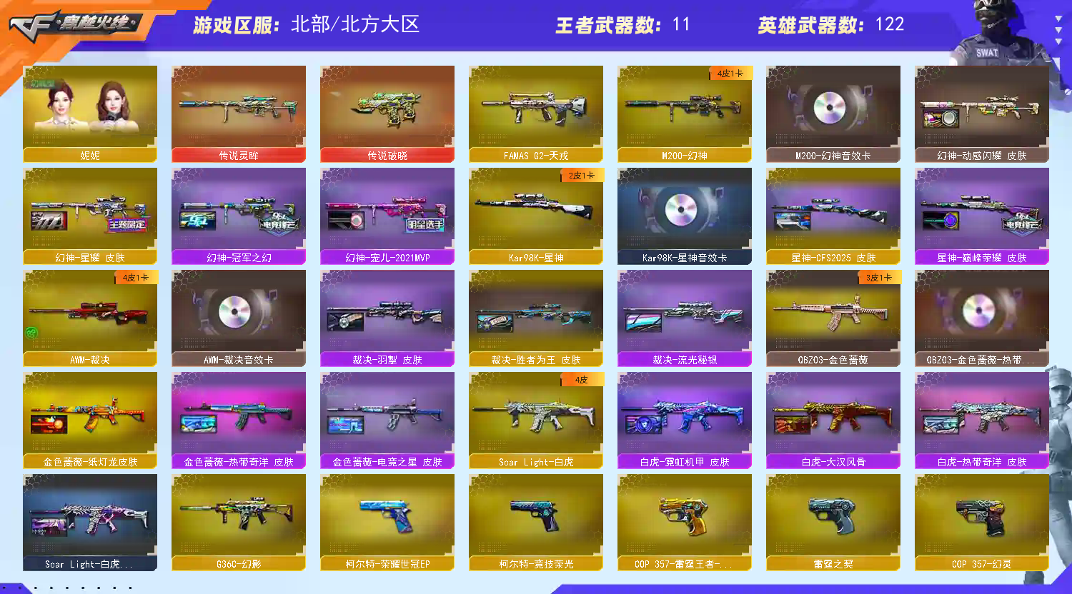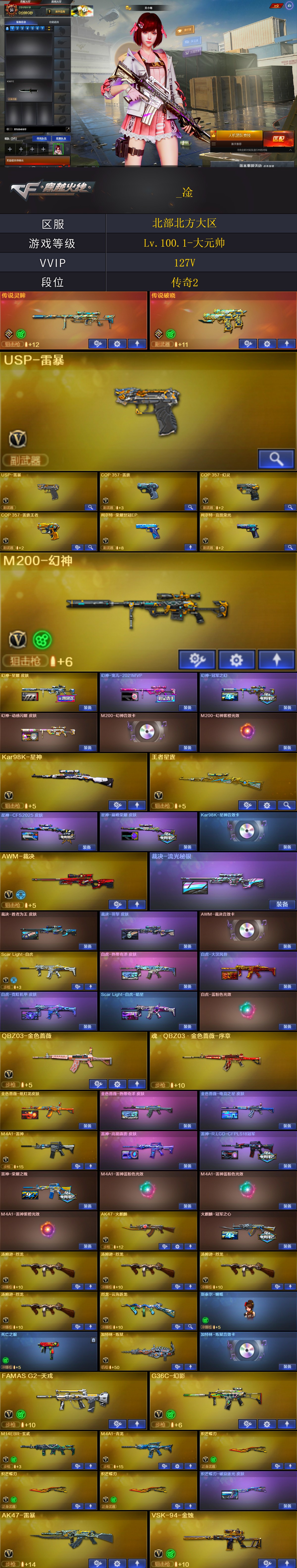 【商品标题】:北部北方大区-127V-可二次实名-【Lv.100.1-大元帅】-【段位:传奇2】 【稀有武器】:传说灵眸/传说破晓/M200-幻神/Kar98K-星神/VSK-94-金蚀/G36C-幻影/ScarLight-白虎/M14EBR-玄武/M4A1-青龙/AK47-雷暴/雷霆之契/USP-雷暴(2)/COP357-幻灵/柯尔特-竞技荣光/COP357-雷霆王者-觉醒版/QBZ03-金色蔷薇/AK47-火麒麟/M4A1-雷神(2)/Barrett-毁灭/Barrett-极光/AWM-裁决/加特林-炼狱/汤姆逊-烈龙(4)/AA-12-雷霆/炽芒蝶刃(3)/斩神刀-雷暴/幻灵之锋(3)/云龙扇 【王者武器】:王者之怒-觉醒版/王者之光-觉醒版/王者星霆 【热门角色】:关小雨/机械姬/鹰/奇洋探员/乔伊教练/王者凌霄/灵狐者-职业经理/潘多拉-X/兔囡囡 【热门音效卡】:M200-幻神音效卡/Kar98K-星神音效卡/AWM-裁决音效卡/加特林-炼狱音效卡/Barrett-毁灭音效卡/Barrett-极光音效卡 【热门皮肤】:幻神-星耀皮肤/幻神-宠儿-2021MVP/幻神-冠军之幻/幻神-动感闪耀皮肤/金色蔷薇-纸灯龙皮肤/雷神-高能霹雳 皮肤/白虎-热带奇洋皮肤/金色蔷薇-热带奇洋皮肤/裁决-羽掣皮肤/雷神-R.LGD-CFPLS18冠军/星神-巅峰荣耀 皮肤/白虎-霓虹机甲 皮肤/炼狱-电子连击皮肤/裁决-流光秘银/白虎-大汉风骨/炽芒蝶刃-破浪逐光皮肤/ScarLight-白虎-暗星/极光-高能霹雳皮肤/火麒麟-冠军之心/屠龙-荣耀之锋(2)/龙啸-冠军之啸/雷神-荣耀之魄 【其他亮点】:斯泰尔-蝴蝶 (截图展示段位不代表实际段位,如赛季更新等不可抗拒因素发生变化,其余道具看截图或咨询客服);USP-雷暴,炽芒蝶刃,妮妮,QBZ03-金色蔷薇,G36C-幻影,M200-幻神,Scar Light-白虎,