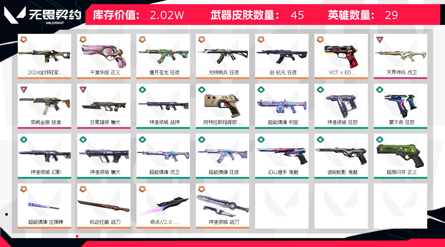 【2w库存摩托直刀.奇点蝴蝶刀.三狂徒青龙.创纪元.光明哨兵.24冠军幻影.天界戍卫】【因赛季更新游戏段付以上号为!】 【套装】:VCTxEDG 队伍套装 【英雄】:幻棱,炼狱,维斯,暮蝶,钛狐,壹决,铁臂,捷风,雷兹,幽影,不死鸟,贤者,猎枭,蝰蛇,零,芮娜,奇乐,尚勃勒,霓虹,斯凯,夜露,星礈,K/O,海神,盖可,黑梦,钢锁 【近战武器】:近战武器-奇点//2.0 蝴蝶刀,近战武器-超能偶像 应援棒,近战武器-机动狂飙 战刀,近战武器-神圣领域 战刀 【狂徒】:狂徒-光明哨兵,狂徒-偃月苍龙,狂徒-创·纪元,狂徒-超能偶像 【幻影】:幻影-2024全球冠军赛,幻影-神圣领域,幻影-聚合之力 【戍卫】:戍卫-天界神兵,戍卫-超能偶像,戍卫-月球哨兵 【獠犬】:獠犬-日冕雄师,獠犬-神圣领域,獠犬-采蜜小蜂队 【冥驹】:冥驹-星云暗涌 【飞将】:飞将-聚合之力 【莽侠】:莽侠-月球哨兵 【战神】:战神-神圣领域,战神-采蜜小蜂队 【判官】:判官-超能偶像,判官-采蜜小蜂队 【雄鹿】:雄鹿-月球哨兵 【骇灵】:骇灵-紫阙金琅,骇灵-星云暗涌 【蜂刺】:蜂刺-聚合之力,蜂刺-星云暗涌 【标配】:标配-超能偶像 【VCT手枪】:标配-VCT x EDG 【正义】:正义-千灵华绽,正义-超限闪存,正义-纳米击,正义-月球哨兵 【鬼魅】:鬼魅-诡秘蛇影,鬼魅-采蜜小蜂队,鬼魅-扑棱扑棱,鬼魅-星云暗涌 【狂怒】:狂怒-神圣领域,狂怒-聚合之力 【短炮】:短炮-梦魇恶魔 【卡面】:终章:激斗汉堡 卡面,进入射程 卡面,《双城之战》拥抱 卡面,精灵大战 卡面,欢迎来到底城 卡面,南瓜盛典 卡面,无畏契约:暮蝶 卡面,修车达人 卡面,正义的化身 卡面,终章:生意人麦宝 卡面,铁之华 卡面,失而复得 卡面,时间到 卡面,最高舞台 卡面,复活专家 卡面,归乡 // 蝰蛇 卡面,超能偶像 卡面,生意人麦宝 卡面,声感陷阱设计图 卡面,钢锁工牌 卡面,战术小伙伴的夏日 卡面,采蜜小蜂队 卡面,聚合之力 卡面,梦幻奶茶 卡面,趁热吃 卡面,无畏契约GO!一卷:芮娜 卡面,无畏契约GO!一卷:零 卡面,代号红色 卡面,新兵报到 卡面,V契约 卡面,无畏契约 卡面,暗潮 卡面 【喷漆】:嗨宝南瓜灯 喷漆,嘭! 喷漆,都算到了 喷漆,控场勿近 喷漆,伤心心 喷漆,小丑猫 喷漆,熊抱 喷漆,又被闪了 喷漆,终极羞辱 喷漆,超级粉丝 喷漆,黯兽卖萌 喷漆,捷风差距 喷漆,惊声尖叫 喷漆,五人成星 喷漆,超能偶像 喷漆,放我出去 喷漆,掩护我 喷漆,大佬发枪 喷漆,边缘试探 喷漆,拼一枪 喷漆,聚合之力 喷漆,采蜜小蜂队 喷漆,梦幻小队 喷漆,五个全都齐了 喷漆,逮到一个 喷漆,买装还是存钱 喷漆,胜利属于无畏契约 喷漆,GLHF 喷漆,无畏契约 喷漆 【挂饰】:终章:猫猫木乃伊 挂饰,悠闲鸡块 挂饰,伞绳 挂饰,《双城之战》小蛋糕 挂饰,第九季//第三幕 纪念币 挂饰,工具腰带 挂饰,无畏契约GO!一卷 芮娜 挂饰,无畏契约GO!一卷 零 挂饰,熔岩灯 挂饰,第九季//第二幕 纪念币 挂饰,终章:这瓜保熟 挂饰,炼狱雪糕 挂饰,糖葫芦 挂饰,袖珍捷风 挂饰,冲上云霄 挂饰,超能偶像 挂饰,迷你浓缩 挂饰,这瓜保熟 挂饰,采蜜小蜂队 挂饰,第九季//一幕 纪念币 挂饰,聚合之力 挂饰,VCT x EDG 挂饰,天外飞客 挂饰,无畏契约 纪念币 挂饰;天界神兵 戍卫,2024全球冠军赛 幻影,紫阙金琅 骇灵,千灵华绽 正义,
