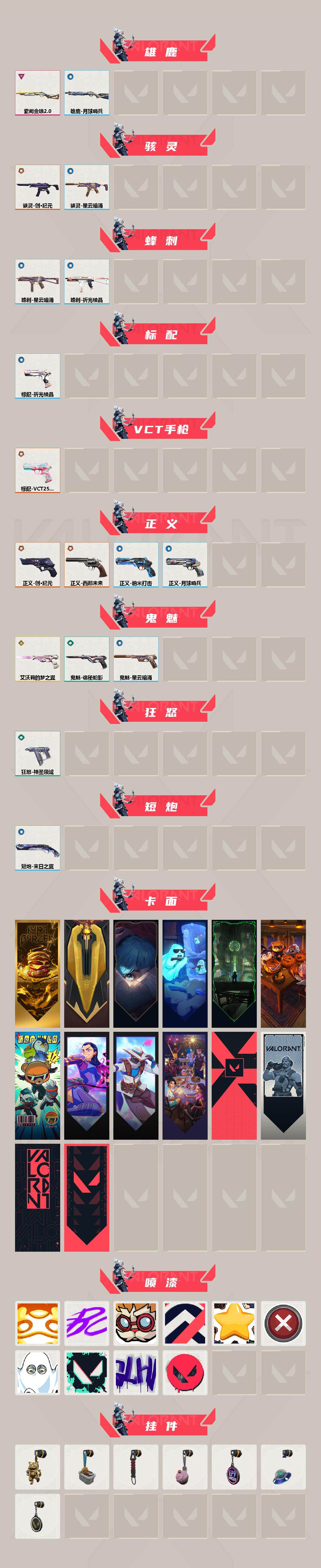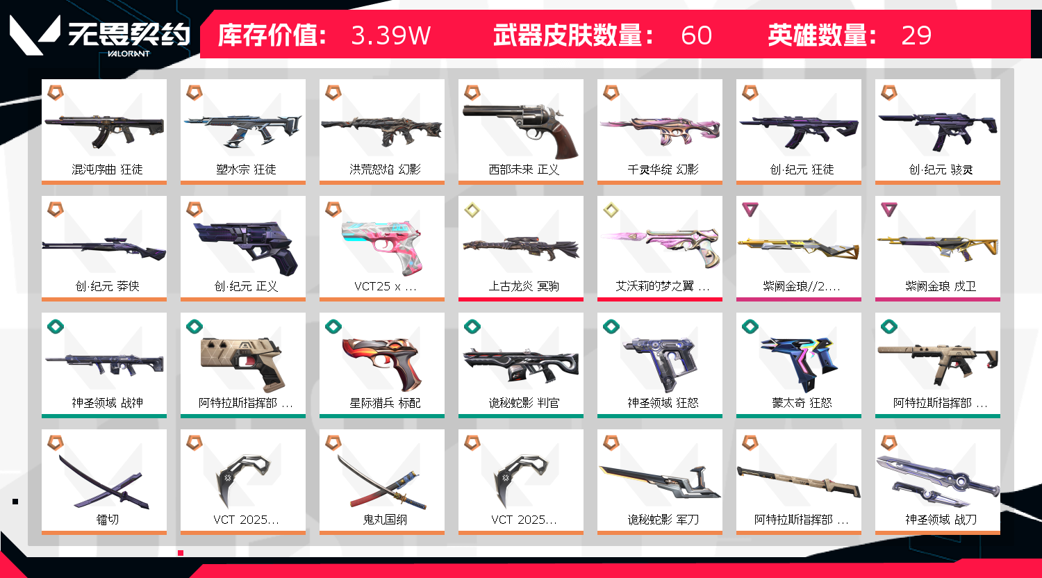 【套装】:VCT 2025 赛季套装,创·纪元套装 【英雄】:幻棱,炼狱,维斯,暮蝶,钛狐,壹决,铁臂,捷风,雷兹,幽影,不死鸟,贤者,猎枭,蝰蛇,零,芮娜,奇乐,尚勃勒,霓虹,斯凯,夜露,星礈,K/O,海神,盖可,黑梦,钢锁 【近战武器】:近战武器-VCT 2025 爪刀,近战武器-镭切,近战武器-鬼丸国纲,近战武器-诡秘蛇影 军刀,近战武器-神圣领域 战刀,近战武器-阿特拉斯指挥部 甩棍 【狂徒】:狂徒-混沌序曲,狂徒-塑水宗,狂徒-创·纪元,狂徒-诡秘蛇影 【幻影】:幻影-洪荒怒焰,幻影-千灵华绽,幻影-神圣领域,幻影-末日之翼 【戍卫】:戍卫-紫阙金琅,戍卫-月球哨兵,戍卫-折光棱晶 【獠犬】:獠犬-神圣领域 【冥驹】:冥驹-上古龙炎,冥驹-星云暗涌 【飞将】:飞将-末日之翼 【莽侠】:莽侠-创·纪元,莽侠-诡秘蛇影,莽侠-月球哨兵 【战神】:战神-神圣领域 【奥丁】:奥丁-末日之翼 【判官】:判官-诡秘蛇影 【雄鹿】:雄鹿-紫阙金琅//2.0,雄鹿-月球哨兵 【骇灵】:骇灵-创·纪元,骇灵-星云暗涌 【蜂刺】:蜂刺-星云暗涌,蜂刺-折光棱晶 【标配】:标配-折光棱晶 【VCT手枪】:标配-VCT25 x BLG 【正义】:正义-创·纪元,正义-西部未来,正义-纳米击,正义-月球哨兵 【鬼魅】:鬼魅-艾沃莉的梦之翼,鬼魅-诡秘蛇影,鬼魅-星云暗涌 【狂怒】:狂怒-神圣领域 【短炮】:短炮-末日之翼 【卡面】:终章:激斗汉堡 卡面,进入射程 卡面,《双城之战》拥抱 卡面,精灵大战 卡面,欢迎来到底城 卡面,南瓜盛典 卡面,战术熊与伙伴们 卡面,无畏契约GO!一卷:芮娜 卡面,无畏契约GO!第卷:零 卡面,天台狂欢 卡面,代号红色 卡面,新兵报到 卡面,V契约 卡面,无畏契约 卡面 【喷漆】:嗨宝南瓜灯 喷漆,嘭! 喷漆,都算到了 喷漆,控场勿近 喷漆,五人成星 喷漆,买装还是存钱 喷漆,凌空惊吓 喷漆,胜利属于无畏契约 喷漆,GLHF 喷漆,无畏契约 喷漆 【挂饰】:终章:猫猫木乃伊 挂饰,悠闲鸡块 挂饰,伞绳 挂饰,《双城之战》小蛋糕 挂饰,第九季//第三幕 纪念币 挂饰,天外飞客 挂饰,无畏契约 纪念币 挂饰;镭切,VCT 2025 爪刀,洪荒怒焰 幻影,混沌序曲 狂徒,塑水宗 狂徒,西部未来 正义,