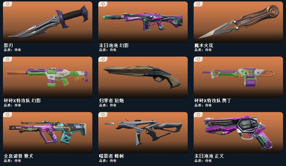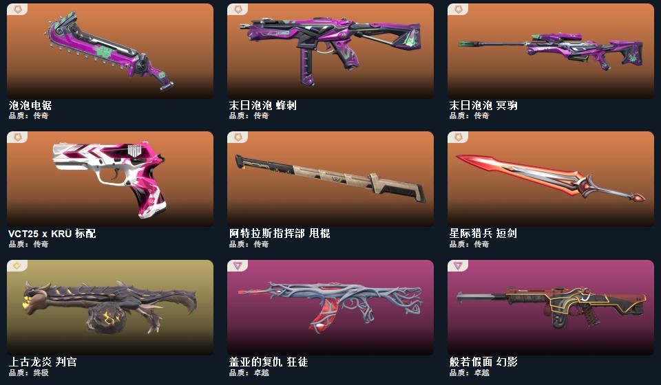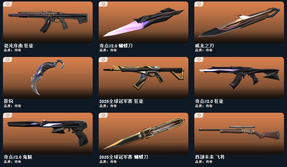 星际猎兵 短剑,2025全球冠军赛 蝴蝶刀,泡泡电锯,影刃,魔术火花,阿特拉斯指挥部 甩棍,影钩,奇点//2.0 蝴蝶刀,威龙之刃,光环序列 战神,光环序列 冥驹,紫阙金琅 戍卫,起源 雄鹿,幻心猎手 鬼魅,无限竞技 骇灵