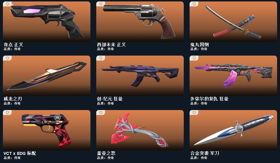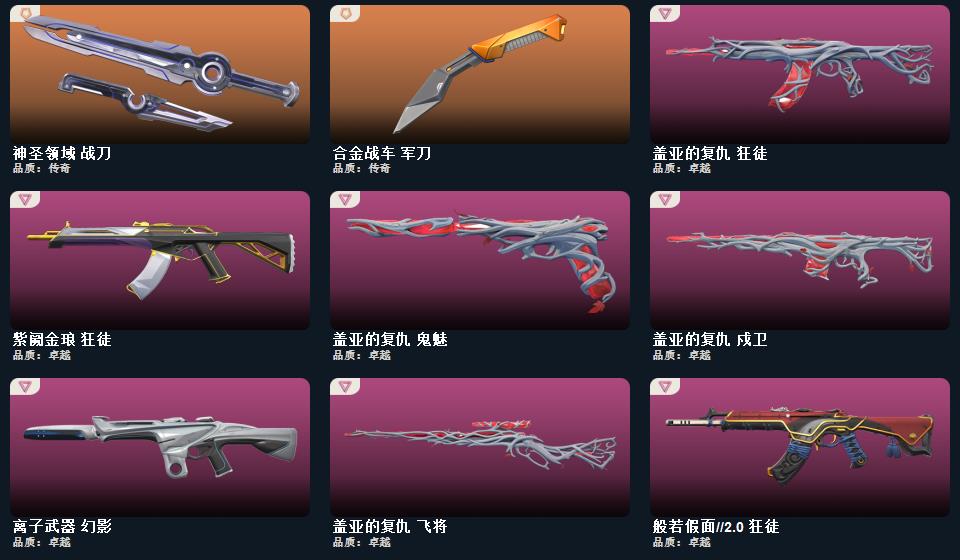 wegame无畏契约★神圣领域 战刀,鬼丸国纲,威龙之刃,盖亚之怒,合金战车 军刀,合金突袭 军刀,神圣领域 战神,星云暗涌 冥驹,多弥尔的复仇 狂徒,月球哨兵 雄鹿,星际猎兵 标配,星云暗涌 蜂刺