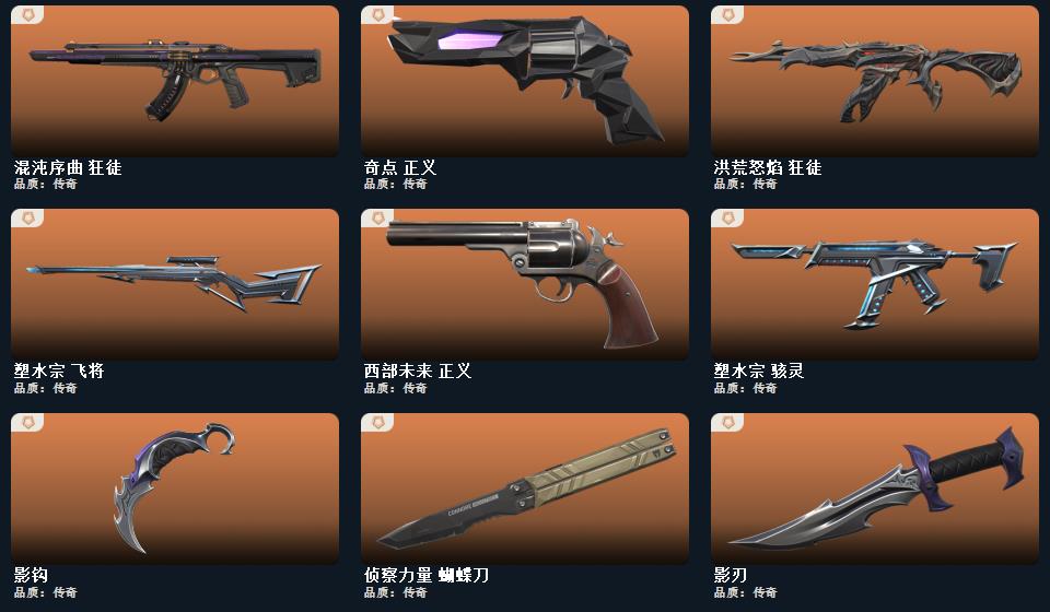 wegame无畏契约★武器皮肤数量:63,星际猎兵 短剑,影钩,影刃,超限闪存 匕首,超能偶像 应援棒,侦察力量 蝴蝶刀,幻心猎手 鬼魅,瑰梦艺语 骇灵,星际猎兵 幻影,星际猎兵 飞将