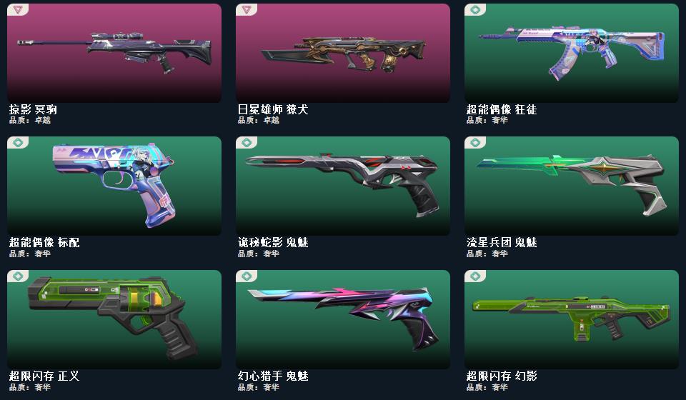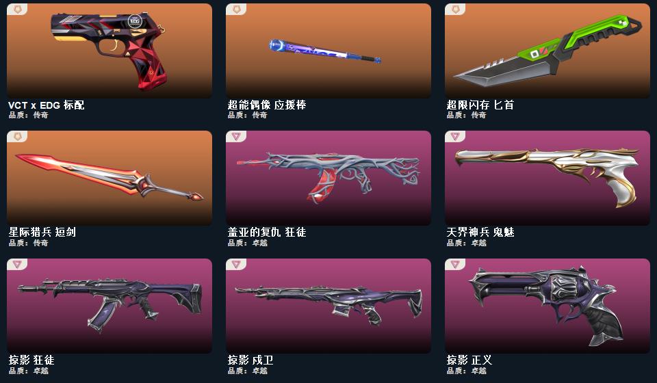 wegame无畏契约★星际猎兵 短剑,影钩,影刃,超限闪存 匕首,超能偶像 应援棒,侦察力量 蝴蝶刀,幻心猎手 鬼魅,瑰梦艺语 骇灵,星际猎兵 幻影,星际猎兵 飞将