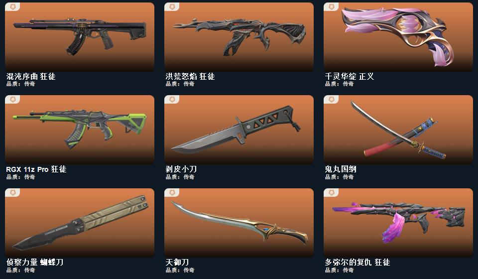 wegame无畏契约★武器皮肤数量:51,碎心裂刃,剥皮小刀,影刃,侦察力量 蝴蝶刀,星际猎兵 短剑,天御刀,鬼丸国纲,超集系统 标配,蒙太奇 骇灵,星际猎兵 判官,蒙太奇 幻影,超集系统 飞将