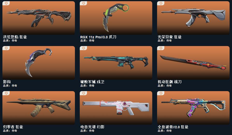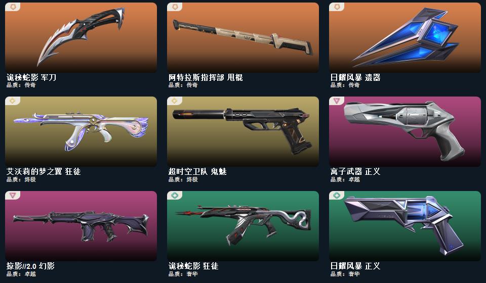 wegame无畏契约★影钩,阿特拉斯指挥部 甩棍,RGX 11z Pro//3.0 爪刀,日耀风暴 遗器,机动狂飙 战刀,诡秘蛇影 军刀,超时空卫队 鬼魅,阿特拉斯指挥部 骇灵,太空穿梭 判官,掠影//2.0 幻影,阿特拉斯指挥部 莽侠