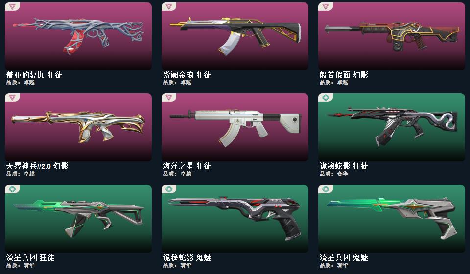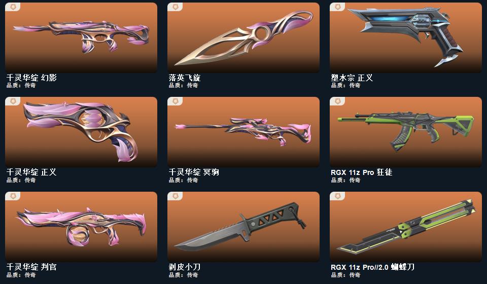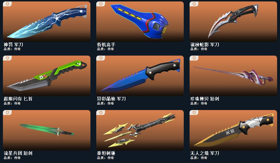 wegame无畏契约★诡秘蛇影 军刀,RGX 11z Pro//2.0 蝴蝶刀,超限闪存 匕首,剥皮小刀,流星兵团 短剑,泰坦刺锤,街机高手,灼骨锤,无人之境 军刀,神罚 军刀,异彩晶棱 军刀,落英飞旋,幻心猎手 鬼魅,超时空卫队 狂徒,诡秘蛇影 莽侠