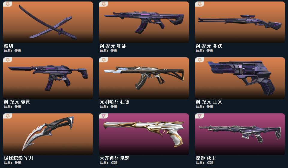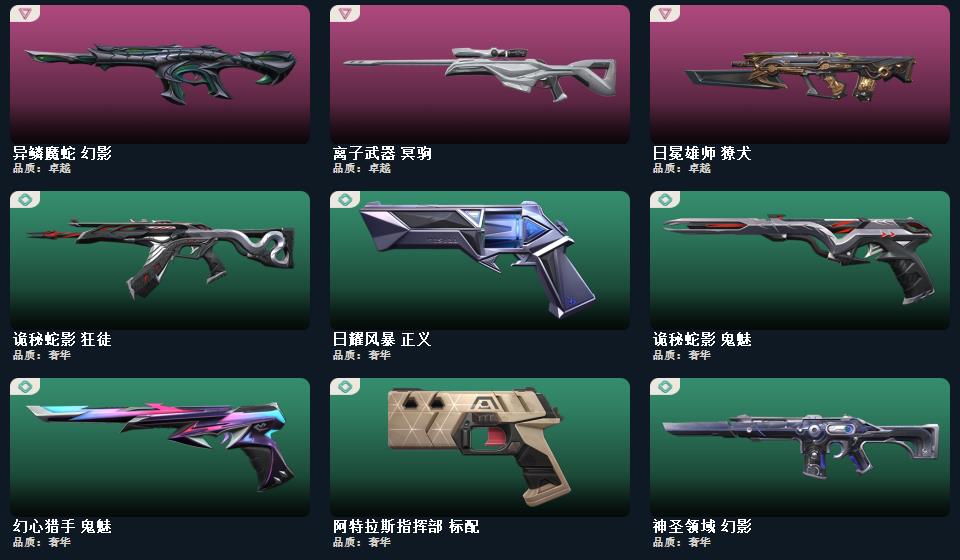 wegame无畏契约★武器皮肤数量:38,诡秘蛇影 军刀,镭切,幻心猎手 鬼魅,折光棱晶 蜂刺,诡秘蛇影 判官,日冕雄师 獠犬,掠影 戍卫,离子武器 冥驹,末日之翼 奥丁