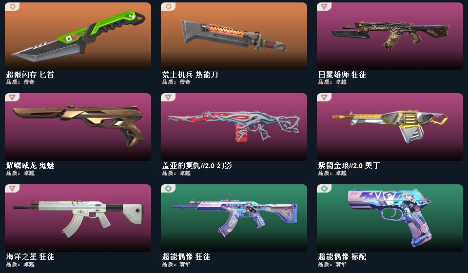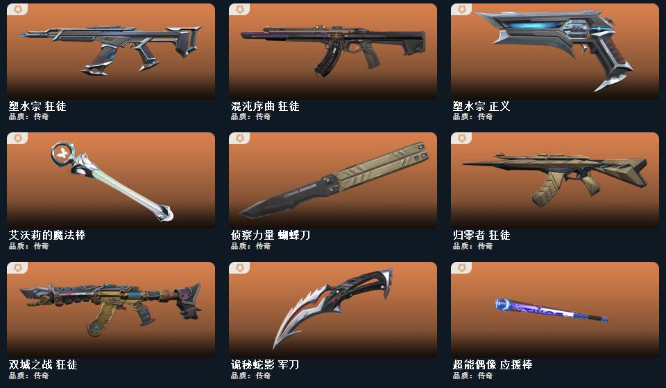 wegame无畏契约★诡秘蛇影 军刀,艾沃莉的魔法棒,荒土机兵 热能刀,超限闪存 匕首,超能偶像 应援棒,侦察力量 蝴蝶刀,日耀风暴 正义,折光棱晶 蜂刺,诡秘蛇影 狂徒,诡秘蛇影 莽侠,末日之翼 奥丁