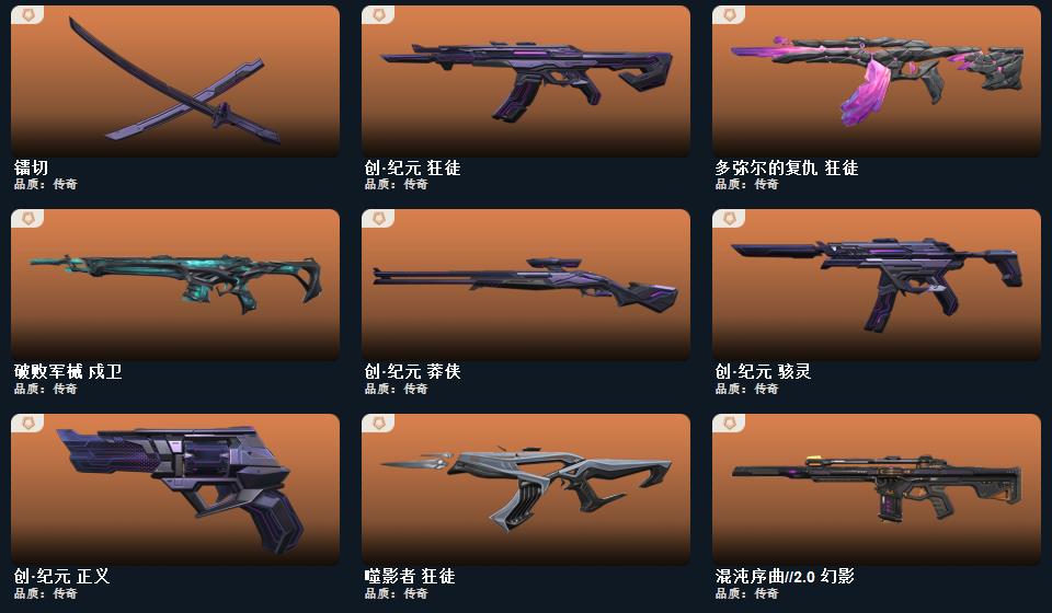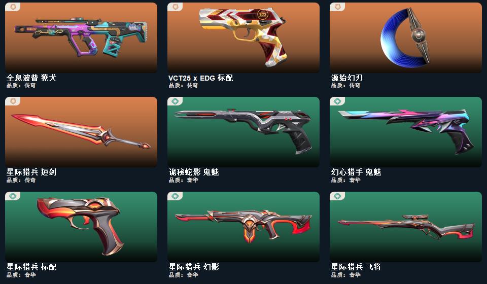 wegame无畏契约★星际猎兵 短剑,源始幻刃,镭切,幻心猎手 鬼魅,瑰梦艺语 骇灵,星际猎兵 判官,噬影者 狂徒,星际猎兵 飞将,光环序列 战神