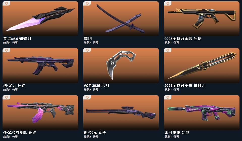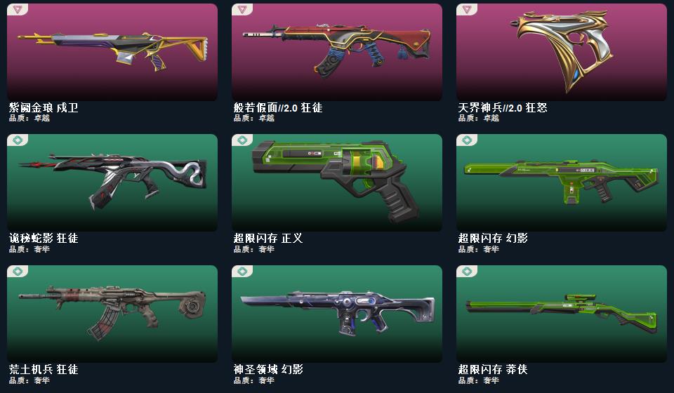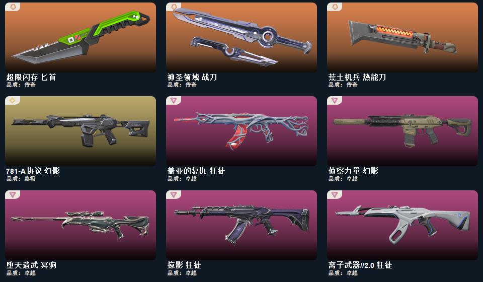 wegame无畏契约★神圣领域 战刀,镭切,荒土机兵 热能刀,超限闪存 匕首,奇点//2.0 蝴蝶刀,光环序列 狂怒,瑰梦艺语 骇灵,星际猎兵 判官,星际猎兵 幻影,光环序列 冥驹
