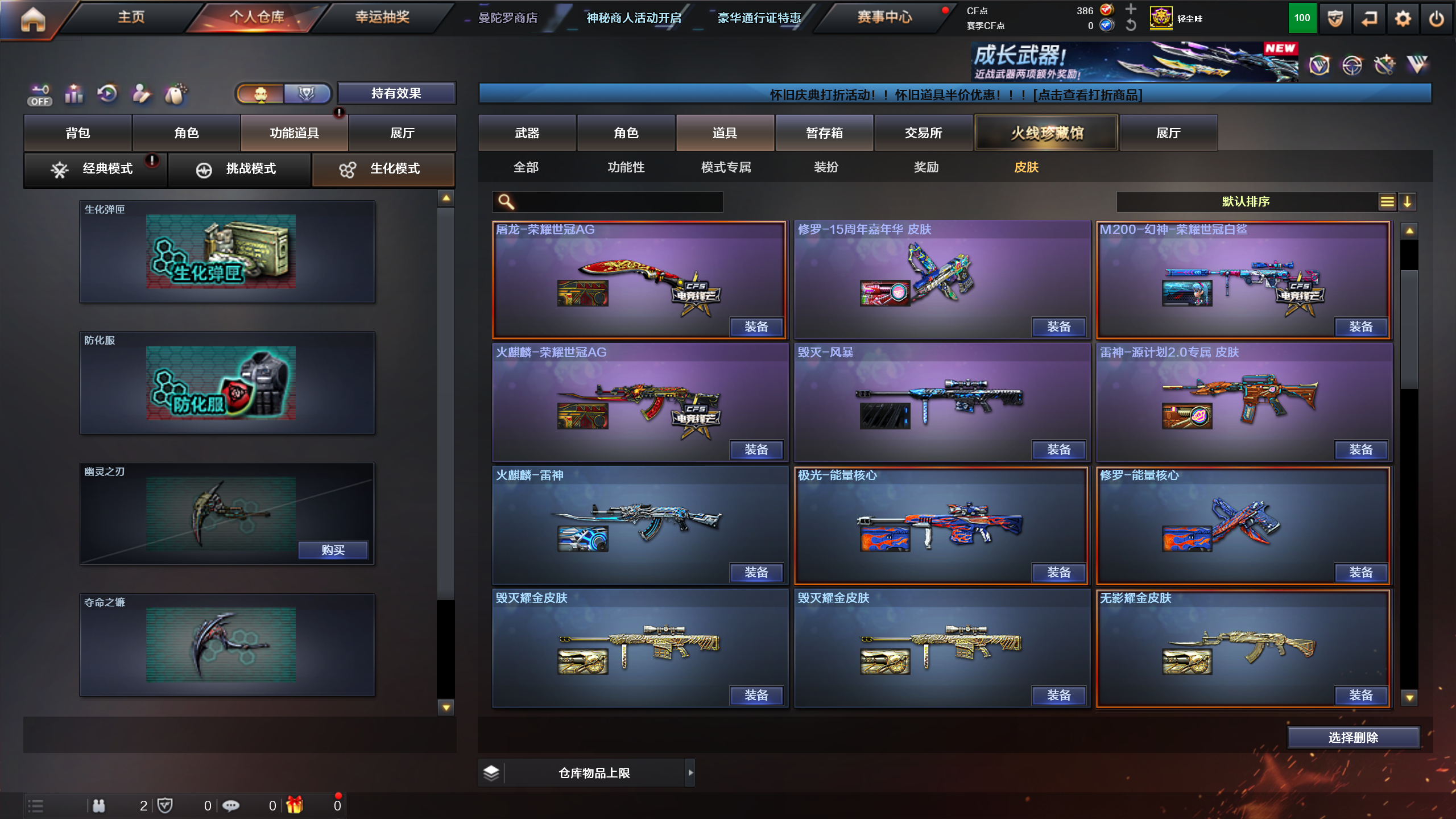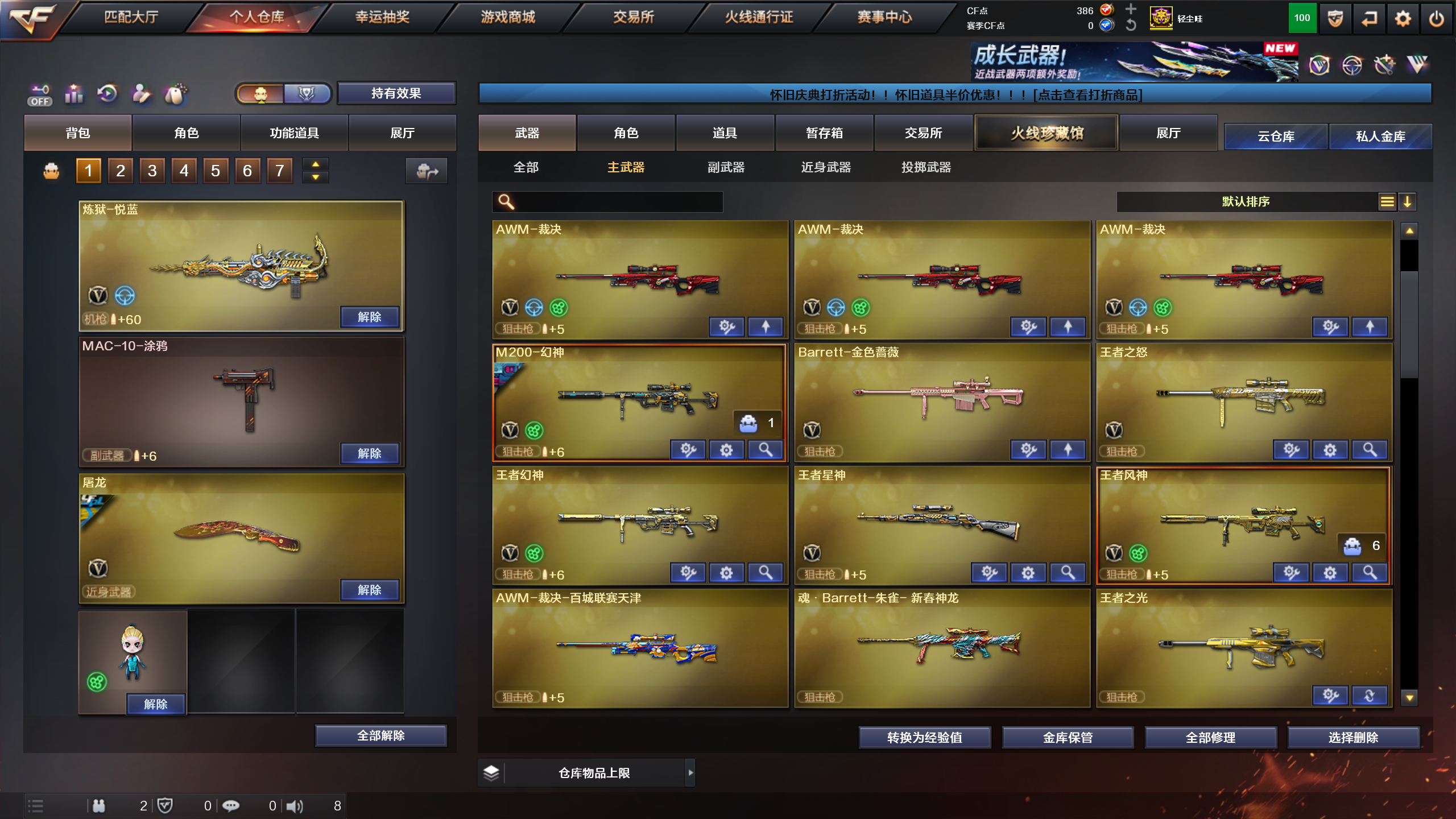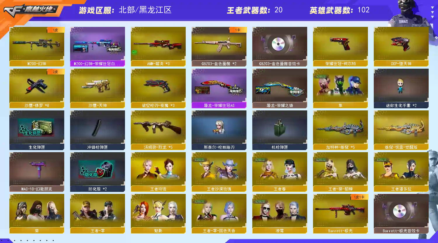 120V/幻神+白鲨冠军/星神/风神/隼/枪娘⑥烈⑥炼狱+悦蓝/柯尔特/cop/7音效/蔷薇qbz+音效/荣耀世冠AG火麒麟+屠龙+柯尔特+雷神/火麒麟+音效+冠军之心+世冠AG+AG战队+轻羽皮/黑骑士+音效/毁灭+2音效+冠军之怒+星空+耀金皮/雷神+音效+荣耀之魄+星空+虎将+星空皮/极光+音效/王者幻神觉醒/王者星神觉醒/王者风神觉醒/2火麒麟/黑龙/3雷神/黑骑士/2无影/黑武士/天启/2黑鲨/5龙血/m4夜魔/2玫瑰精灵/2蔷薇qbz/3烈火/王者之魄觉醒/王者冰魄觉醒/王者芳薇觉醒/荣耀世冠雷神/天龙/4毁灭/极光/4裁决/王者之怒觉醒/8修罗/天神/cop堕天神/3破空枪刃夜魔/天神网剧套装/3屠龙+荣耀之峰+世冠AG皮/2擎天/麒麟刺/马来剑夜魔/王者之峰觉醒/王者之击觉醒/7高爆夜魔+7闪+7烟/火麒麟绝技/王者炎心/王者之城心武光灵/cat+刀锋/牛牛AK/金色小号/cop旗袍/3涂鸦手枪/黄金生化钩/手斧镜/2迷你生化手雷/角色:隼/凌霄/葵/王者春/王者葵貂蝉/王者零/王者零传说之路/王者玲珑/王者沙漠玫瑰/王者潘多拉/魅影/灵狐者职业经理/炽天使/对讲机/2炫彩背包/紫金大元首/全背包/vip/伪装幽灵/全弹夹/生化爆破双全装;荣耀世冠-柯尔特,隼,王者沙漠玫瑰,QBZ03-金色蔷薇,M200-幻神,