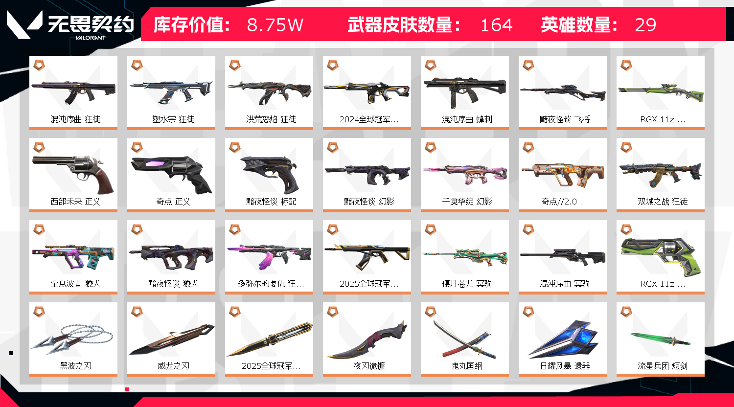 2025冠军套 2022冠军套 混沌序曲套 2024冠军套 显卡3.0套 奇点2.0套 10刀皮;黑波之刃,威龙之刃,盖亚的复仇 狂徒,洪荒怒焰 狂徒,掠影 狂徒,侦察力量 幻影,紫阙金琅 狂徒,