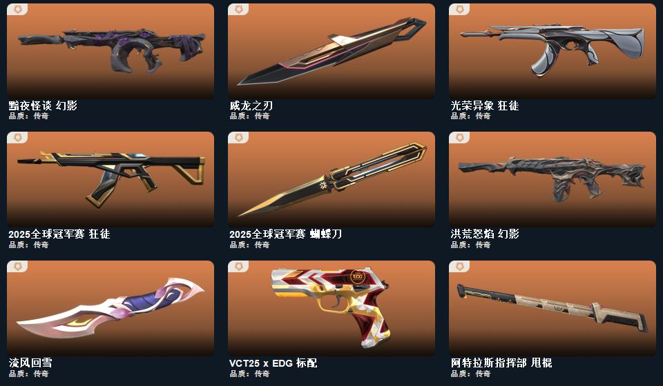 wegame无畏契约★流风回雪,2025全球冠军赛 蝴蝶刀,阿特拉斯指挥部 甩棍,威龙之刃,艾沃莉的梦之翼 鬼魅,阿特拉斯指挥部 骇灵,太空穿梭 判官,盖亚的复仇 狂徒,阿特拉斯指挥部 莽侠