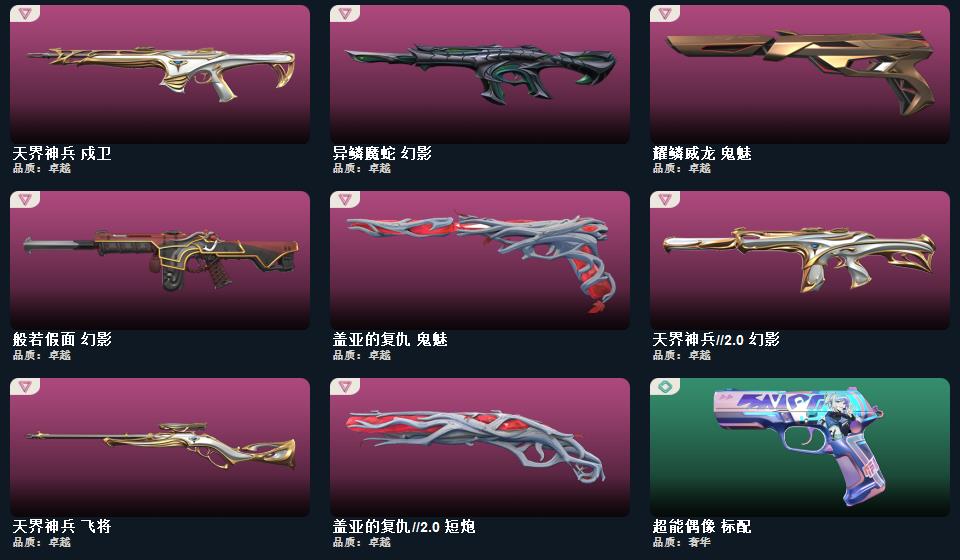 wegame无畏契约★日耀风暴 遗器,诡秘蛇影 军刀,超限闪存 匕首,流星兵团 短剑,落英飞旋,珍珠棘贝 短剑,盖亚的复仇//2.0 短炮,日耀风暴 骇灵,幻语魔咒 雄鹿,异鳞魔蛇 幻影,堕天遗武 冥驹,日耀风暴 奥丁