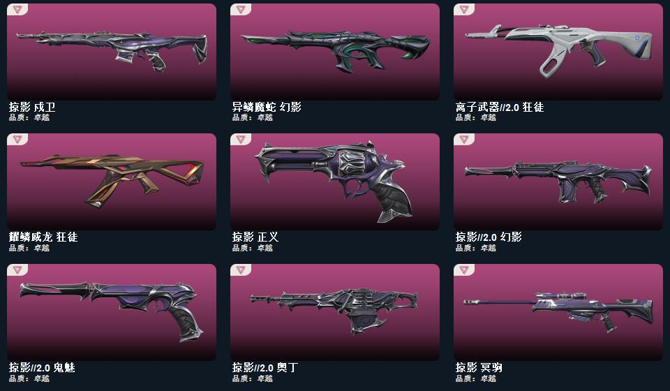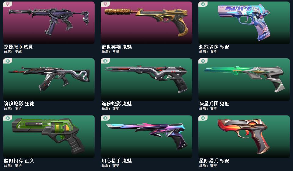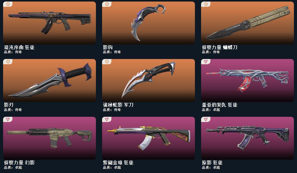wegame无畏契约★影钩,诡秘蛇影 军刀,影刃,侦察力量 蝴蝶刀,掠影//2.0 骇灵,幻心猎手 鬼魅,紫阙金琅 狂徒,诡秘蛇影 莽侠,掠影//2.0 奥丁
