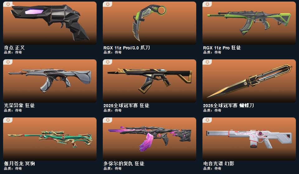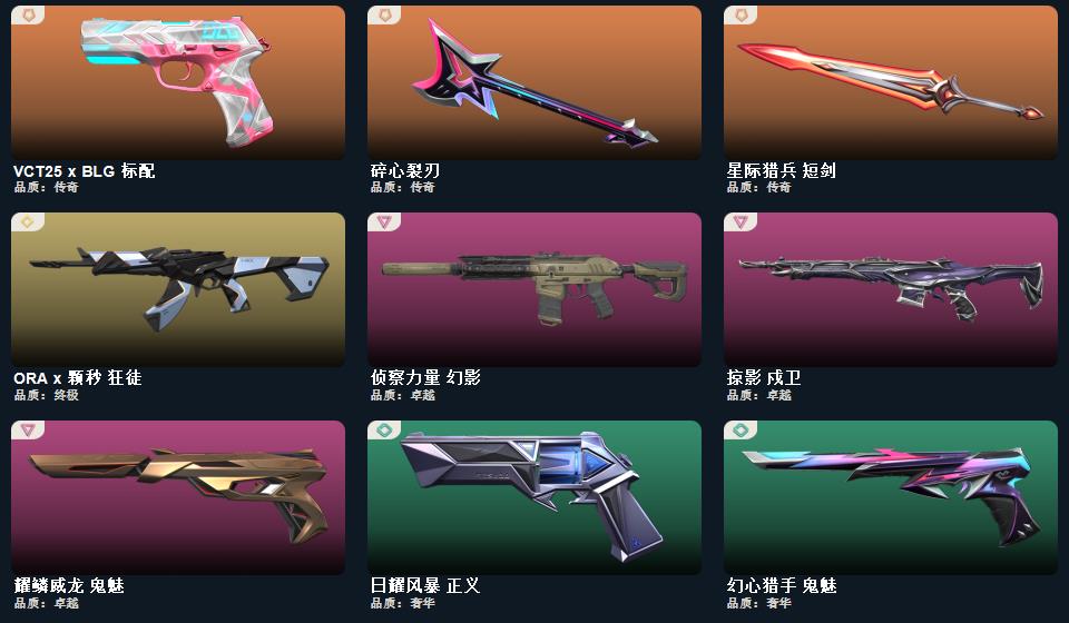 wegame无畏契约★碎心裂刃,星际猎兵 短剑,2025全球冠军赛 蝴蝶刀,奇点 正义,甜心猎手 蜂刺,星际猎兵 判官,侦察力量 幻影,诛心猎手 冥驹,诛心猎手 奥丁