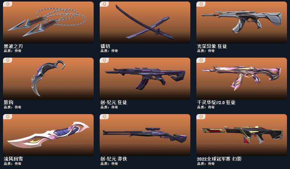 wegame无畏契约★影钩,流风回雪,碎心裂刃,阿特拉斯指挥部 甩棍,2022全球冠军赛 蝴蝶刀,日耀风暴 遗器,诡秘蛇影 军刀,黑波之刃,甜心猎手 短炮,甜心猎手 蜂刺,千灵华绽//2.0 狂徒,诛心猎手 冥驹,诛心猎手 奥丁