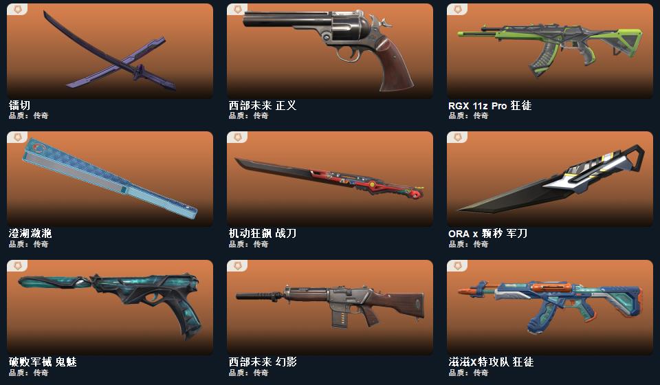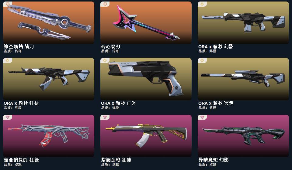 wegame无畏契约★碎心裂刃,机动狂飙 战刀,ORA x 颗秒 军刀,澄湖潋滟,神圣领域 战刀,镭切,甜心猎手 短炮,甜心猎手 蜂刺,异鳞魔蛇 幻影,诛心猎手 冥驹,月球哨兵 雄鹿