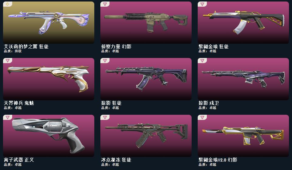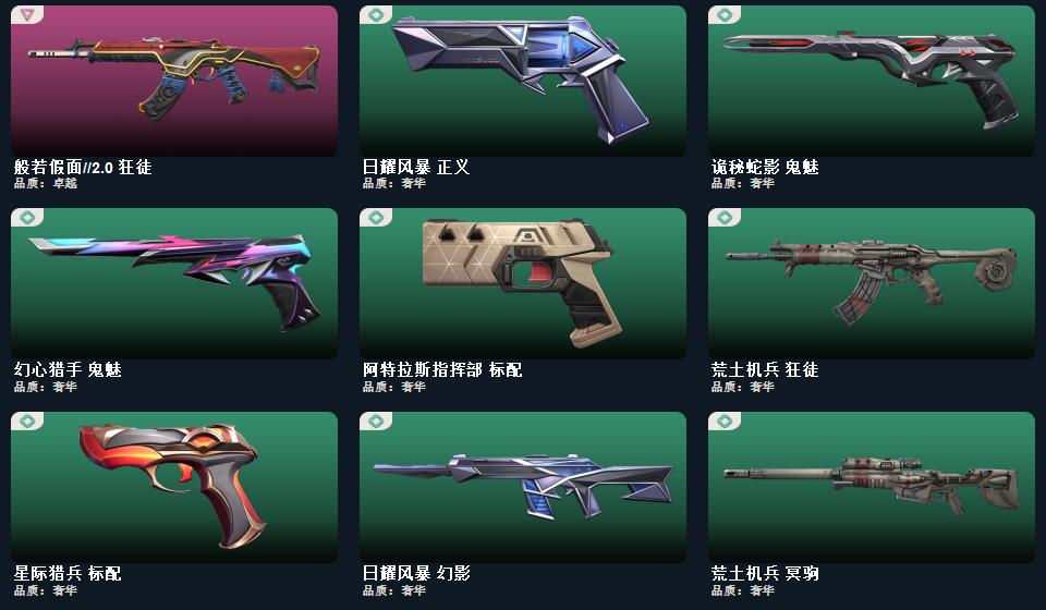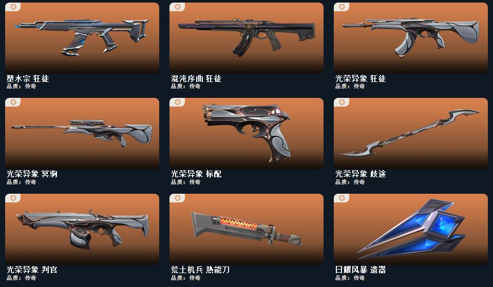 wegame无畏契约★日耀风暴 遗器,光荣异象 歧途,荒土机兵 热能刀,幻心猎手 鬼魅,日耀风暴 骇灵,幻语魔咒 雄鹿,紫阙金琅 狂徒,甜蜜战术 冥驹,日耀风暴 奥丁