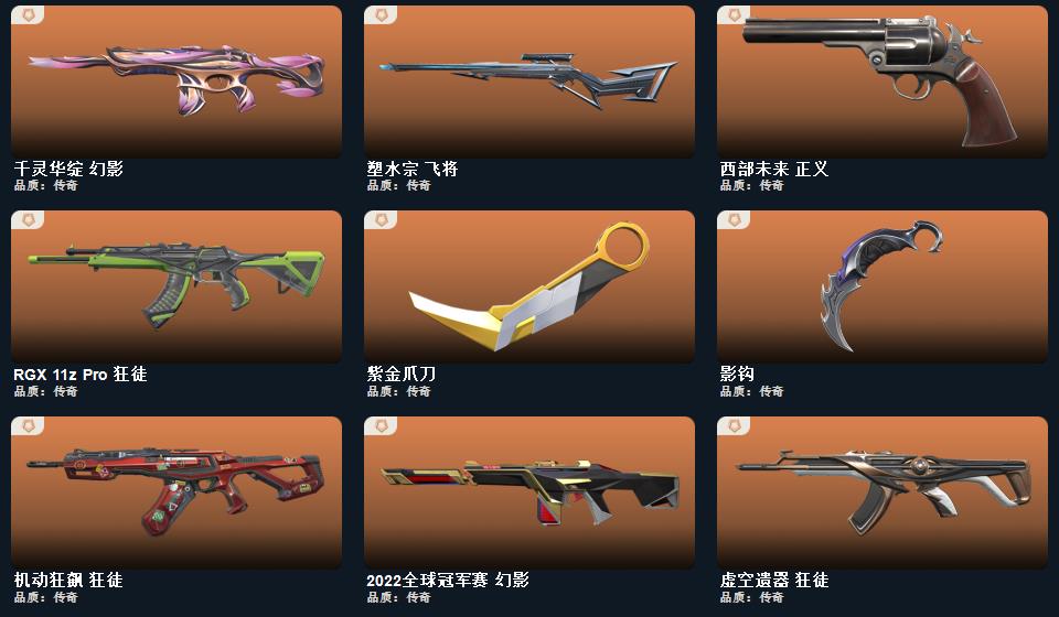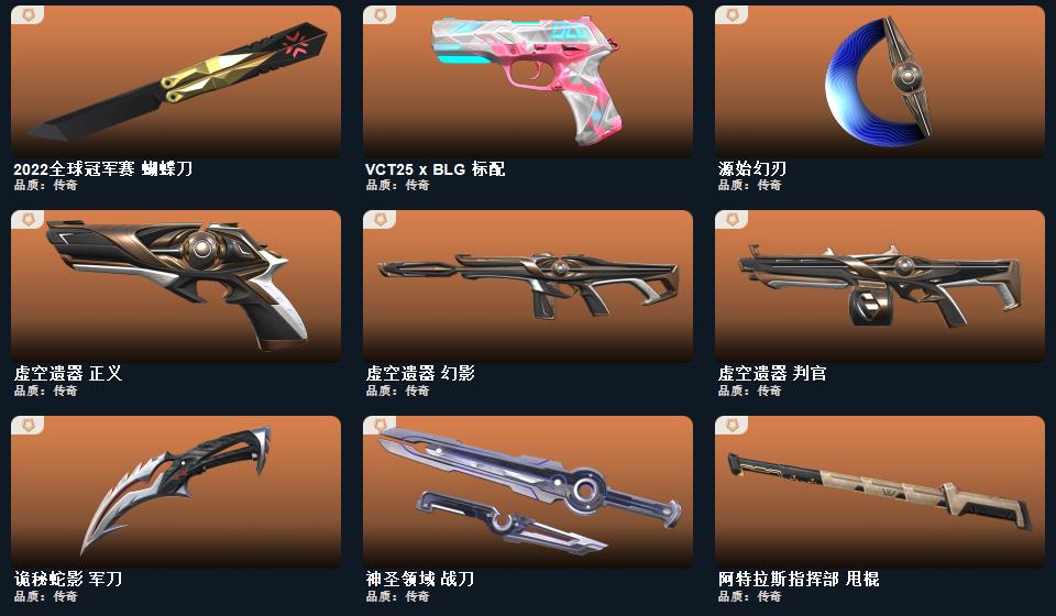 阿特拉斯指挥部 甩棍,影钩,日耀风暴 遗器,2022全球冠军赛 蝴蝶刀,诡秘蛇影 军刀,神圣领域 战刀,源始幻刃,紫金爪刀,幻心猎手 鬼魅,日耀风暴 骇灵,日冕雄师 獠犬,悠闲猫生 飞将,日耀风暴 奥丁
