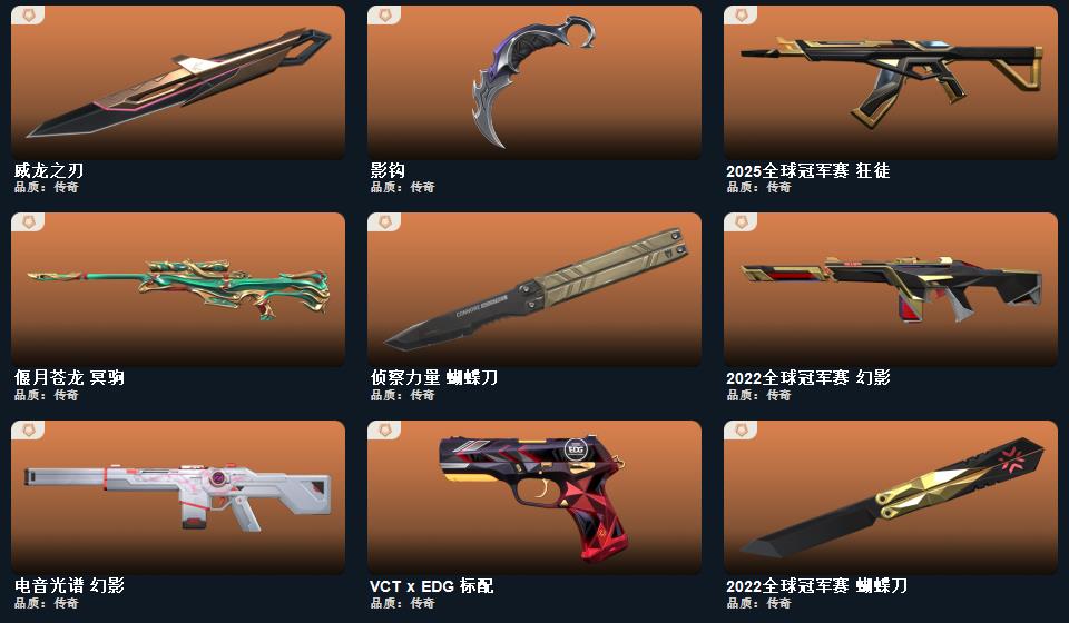 wegame无畏契约★影钩,2022全球冠军赛 蝴蝶刀,超限闪存 匕首,超能偶像 应援棒,黑波之刃,RGX 11z Pro//3.0 爪刀,紫金爪刀,侦察力量 蝴蝶刀,幻心猎手 鬼魅,掠影//2.0 骇灵,025全球冠军赛 狂徒,诡秘蛇影 莽侠