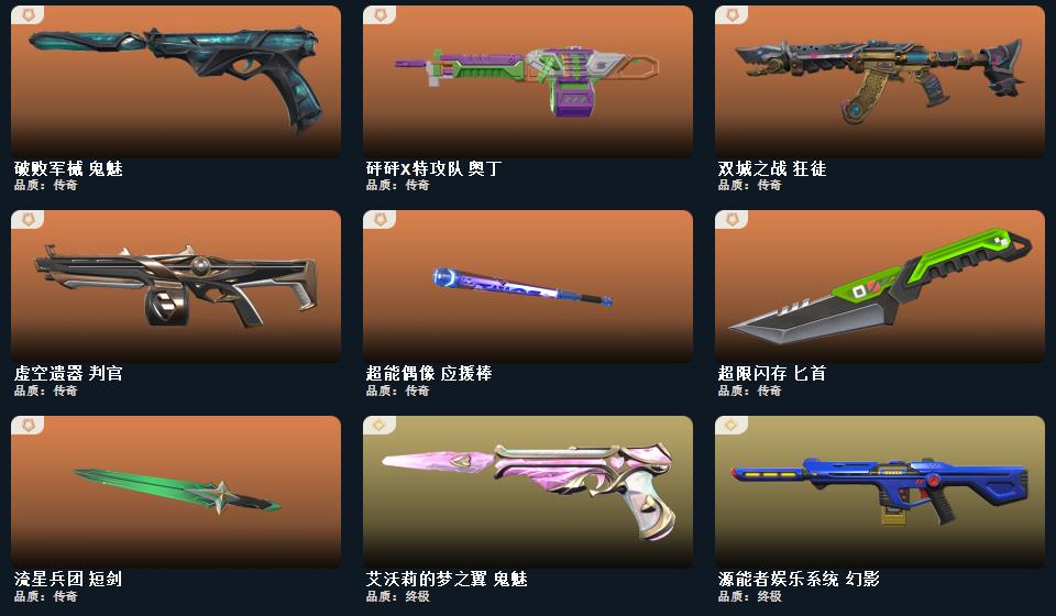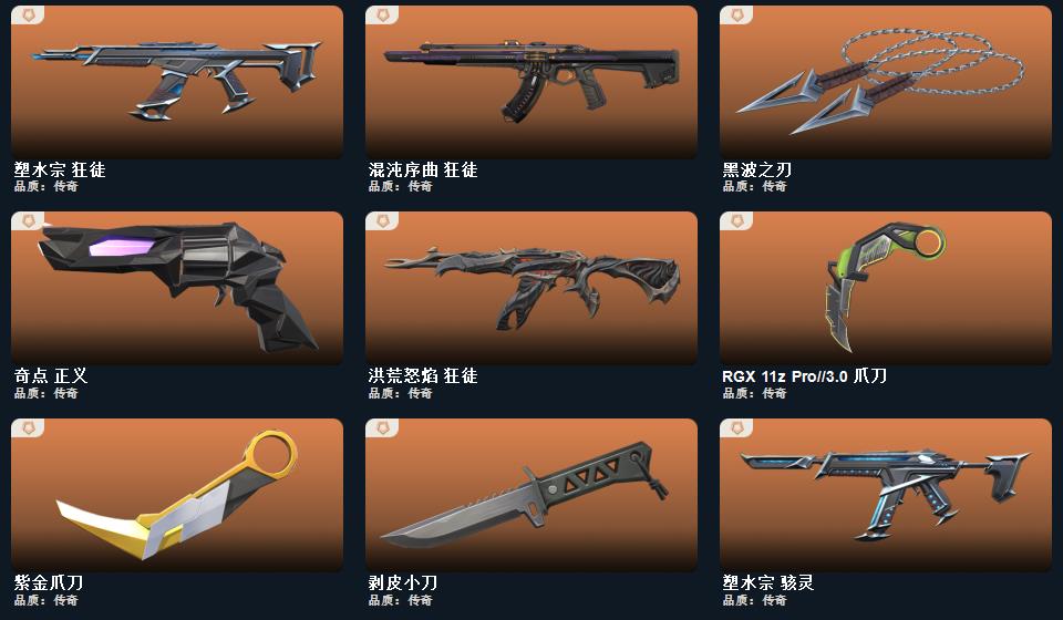 wegame无畏契约★武器皮肤数量:107,影钩,2022全球冠军赛 蝴蝶刀,超限闪存 匕首,超能偶像 应援棒,黑波之刃,RGX 11z Pro//3.0 爪刀,紫金爪刀,侦察力量 蝴蝶刀,幻心猎手 鬼魅,掠影//2.0 骇灵,025全球冠军赛 狂徒,诡秘蛇影 莽侠