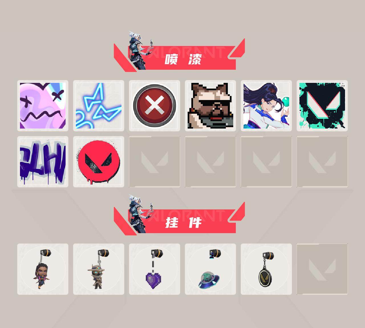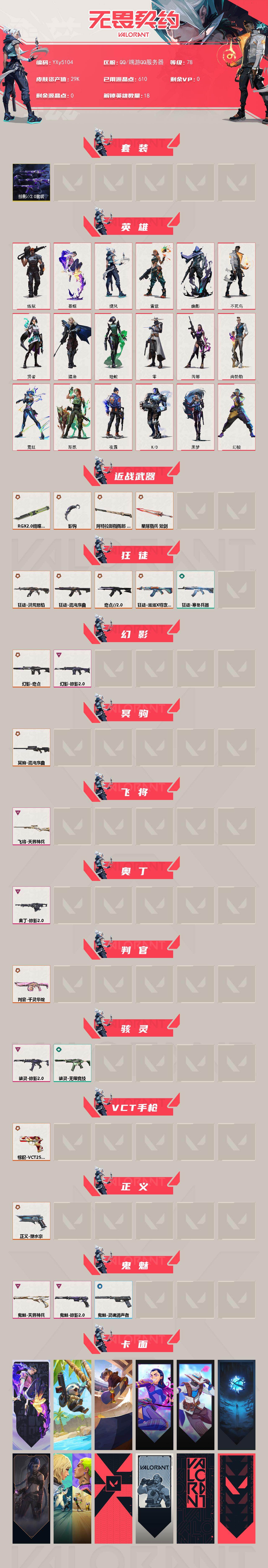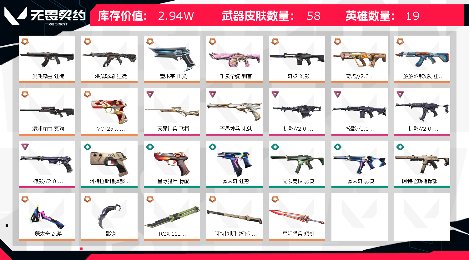 【套装】:掠影//2.0套装 【英雄】:幻棱,炼狱,暮蝶,捷风,雷兹,幽影,不死鸟,贤者,猎枭,蝰蛇,零,芮娜,尚勃勒,霓虹,斯凯,夜露,K/O,黑梦 【近战武器】:近战武器-影钩,近战武器-RGX 11z Pro//2.0 蝴蝶刀,近战武器-阿特拉斯指挥部 甩棍,近战武器-星际猎兵 短剑 【狂徒】:狂徒-洪荒怒焰,狂徒-混沌序曲,狂徒-奇点//2.0,狂徒-滋滋X特攻队,狂徒-寒冬兵器 【幻影】:幻影-奇点,幻影-掠影//2.0 【冥驹】:冥驹-混沌序曲 【飞将】:飞将-天界神兵 【奥丁】:奥丁-掠影//2.0 【判官】:判官-千灵华绽 【骇灵】:骇灵-掠影//2.0,骇灵-无限竞技 【VCT手枪】:标配-VCT25 x AG 【正义】:正义-塑水宗 【鬼魅】:鬼魅-天界神兵,鬼魅-掠影//2.0,鬼魅-灵魂消声者 【卡面】:无畏契约:暮蝶 卡面,树懒大作战 卡面,Clutch 卡面,无畏契约GO!一卷:芮娜 卡面,无畏契约GO!一卷:零 卡面,无垠星环 卡面,《双城之战》金克丝 卡面,钢锁vs盖可 卡面,代号红色 卡面,新兵报到 卡面,V契约 卡面,无畏契约 卡面 【喷漆】:伤心心 喷漆,霓光四射 喷漆,买装还是存钱 喷漆,关门放狗 喷漆,无畏契约GO!一卷:贤者 喷漆,胜利属于无畏契约 喷漆,GLHF 喷漆,无畏契约 喷漆 【挂饰】:无畏契约GO!一卷 芮娜 挂饰,无畏契约GO!第卷 零 挂饰,薰衣草之心 挂饰,天外飞客 挂饰,无畏契约 纪念币 挂饰;洪荒怒焰 狂徒,混沌序曲 狂徒,天界神兵 飞将,天界神兵 鬼魅,塑水宗 正义,