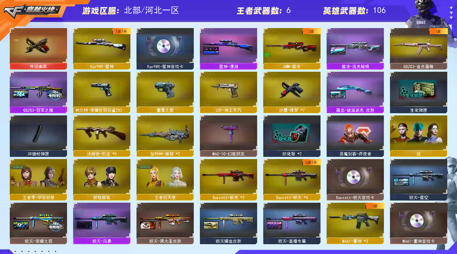 《传说幽冥》《星神➕星神漫游➕星神音效卡》《裁决➕裁决流光秘银》《王者风神》《cop雷霆 usp神工天巧 柯尔特荣耀世冠白鲨》《雷霆套》《qbz金色蔷薇》《金色蔷薇古蛇迷踪》《qbz天罚》《m4雷霆》《毁灭》《火麒麟》《黑龙》《雷神》《黑骑士》《黑武士》《2炼狱 5烈龙》《朱雀蛇隐踪》《awm再燃火线》《王者沙鹰神勇金戈》《迷你钢铁终结者》《迷你救赎猎手》《王者汪汪芭蕾特》《加特林机械猎手》《牛牛ak47》《猫猫手套》《乔伊教练 蛇隐踪 王者炽天使 王者零华冠丽服 修道士 女主播》《超级背包 》《a背包套装扩展券》《鹿小盯语音包》《雷神音效卡 毁灭音效卡》《qbz冠军之薇 火麒麟百城 毁灭风暴 火麒麟荣耀世冠ag 火麒麟cfs2018 毁灭荣耀之怒 天龙传奇70kg 雷神荣耀之魄 雷神某鱼平台皮肤》;柯尔特-荣耀世冠白鲨2023,传说幽冥,QBZ03-金色蔷薇,Kar98K-星神,