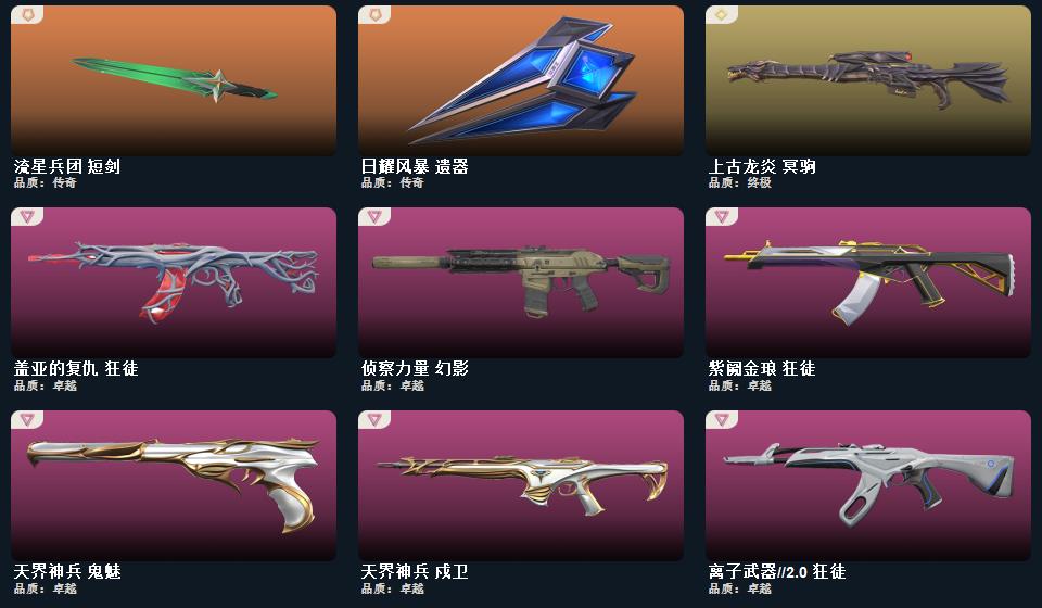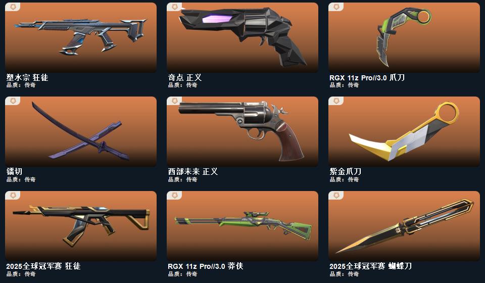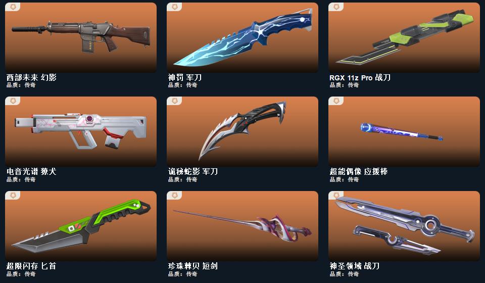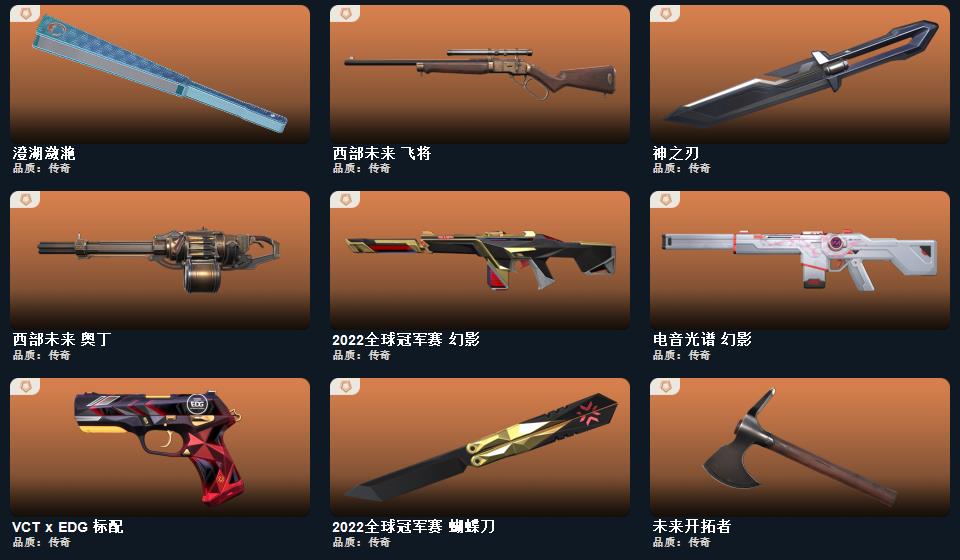 wegame无畏契约★025全球冠军赛 蝴蝶刀,2022全球冠军赛 蝴蝶刀,日耀风暴 遗器,RGX 11z Pro 战刀,神之刃,诡秘蛇影 军刀,神圣领域 战刀,未来开拓者,镭切,神罚 军刀,超限闪存 匕首,幻心猎手 鬼魅,无限竞技 骇灵,离子武器 幻影,甜蜜战术 冥驹