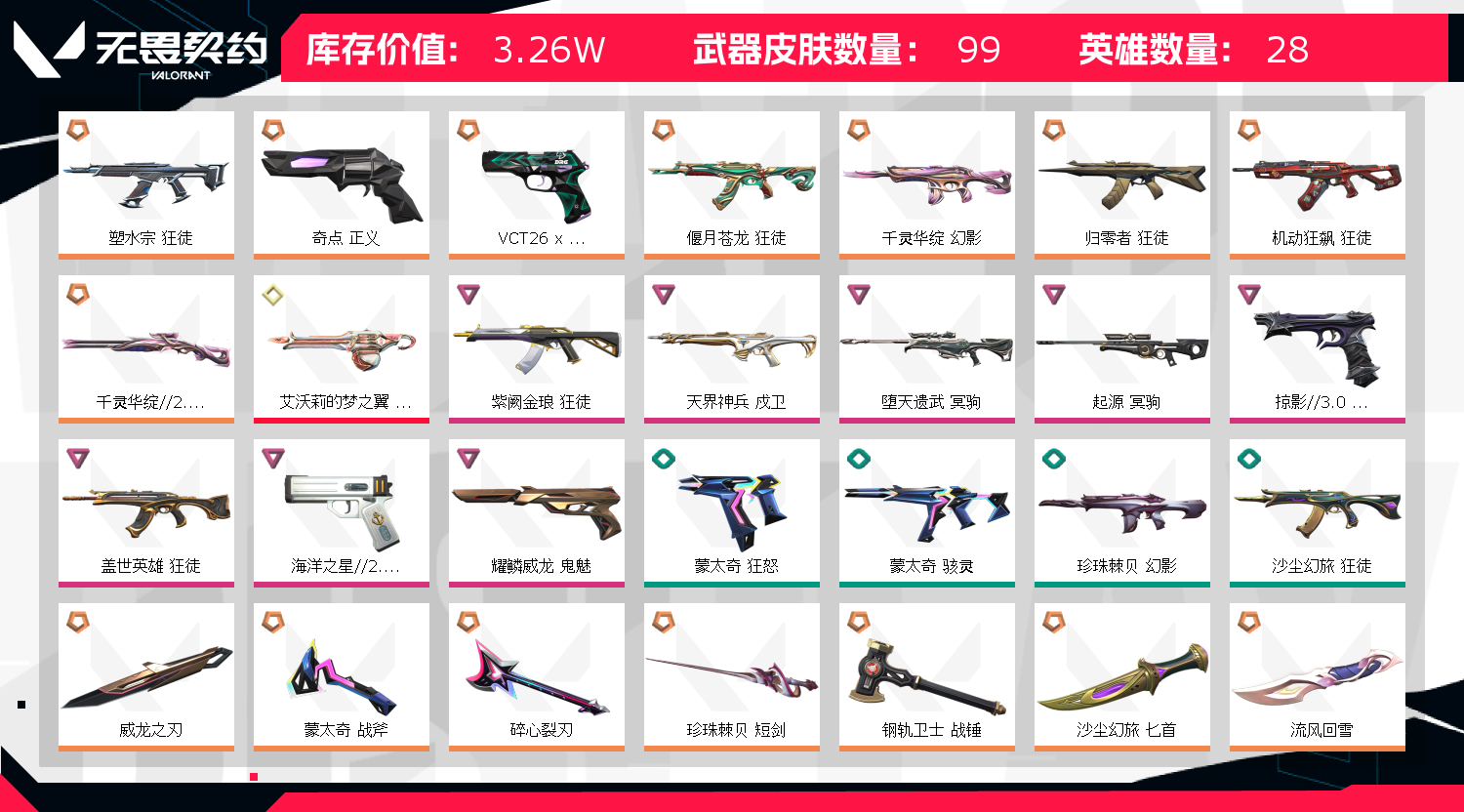 【套装】:耀鳞威龙套装 【英雄】:幻棱,炼狱,维斯,暮蝶,钛狐,壹决,铁臂,捷风,雷兹,幽影,不死鸟,贤者,猎枭,蝰蛇,零,芮娜,奇乐,尚勃勒,霓虹,斯凯,夜露,星礈,K/O,海神,盖可,黑梦,钢锁 【近战武器】:近战武器-流风回雪,近战武器-威龙之刃,近战武器-珍珠棘贝 短剑,近战武器-钢轨卫士 战锤,近战武器-弧光异彩 军刀,近战武器-沙尘幻旅 匕首 【狂徒】:狂徒-归零者,狂徒-机动狂飙,狂徒-塑水宗,狂徒-偃月苍龙,狂徒-盖世英雄,狂徒-耀鳞威龙,狂徒-紫阙金琅,狂徒-钢轨卫士,狂徒-弧光异彩,狂徒-沙尘幻旅 【幻影】:幻影-千灵华绽,幻影-噬源兽防卫工程,幻影-珍珠棘贝,幻影-战术小伙伴 【戍卫】:戍卫-天界神兵,戍卫-钢轨卫士,戍卫-珍珠棘贝,戍卫-彩梦之城,戍卫-萌彩剪影 【獠犬】:獠犬-弧光异彩,獠犬-复古浪潮,獠犬-胡桃狂想,獠犬-战术小伙伴 【冥驹】:冥驹-堕天遗武,冥驹-起源,冥驹-复古浪潮,冥驹-胡桃狂想 【飞将】:飞将-沙尘幻旅,飞将-信手涂鸦,飞将-光导纤维 【莽侠】:莽侠-千灵华绽//2.0,莽侠-深海水族 【战神】:战神-萌彩剪影,战神-深海水族 【奥丁】:奥丁-艾沃莉的梦之翼,奥丁-信手涂鸦,奥丁-战术小伙伴 【判官】:判官-萌彩剪影 【雄鹿】:雄鹿-彩梦之城,雄鹿-复古浪潮 【骇灵】:骇灵-沙尘幻旅,骇灵-珍珠棘贝,骇灵-光导纤维,骇灵-信手涂鸦 【蜂刺】:蜂刺-弧光异彩,蜂刺-胡桃狂想,蜂刺-深海水族,蜂刺-战术小伙伴 【追猎】:追猎-掠影//3.0 【标配】:标配-海洋之星//2.0,标配-超能偶像,标配-彩梦之城,标配-光导纤维 【正义】:正义-奇点,正义-沙尘幻旅,正义-传奇制造,正义-复古浪潮 【鬼魅】:鬼魅-耀鳞威龙,鬼魅-光导纤维,鬼魅-胡桃狂想,鬼魅-宿怨,鬼魅-信手涂鸦 【狂怒】:狂怒-钢轨卫士,狂怒-珍珠棘贝,狂怒-萌彩剪影 【短炮】:短炮-钢轨卫士,短炮-弧光异彩,短炮-深海水族 【卡面】:正义的化身 卡面,铁之华 卡面,时间到 卡面,最高舞台 卡面,声感陷阱设计图 卡面,梦幻奶茶 卡面,无畏契约:尚勃勒 卡面,源能反应 卡面,零点嗅探设计图 卡面,终章:瓦娃雪糕 卡面,表象之下 卡面,虹吸式咖啡壶 卡面,源能者美容 卡面,脚踝终结者 卡面 ,夜班 卡面,瓦娃雪糕 卡面 ,沙雕爆能器 卡面,无畏契约GO!一卷:芮娜 卡面,深海水族 卡面,珍珠棘贝 卡面,复古浪潮 卡面,盖可工牌 卡面,清除名单 卡面,无畏契约GO!一卷:零 卡面,终章:同步耍酷 卡面,龍记 卡面,化茧成蝶 卡面,比比看谁快? 卡面,先瓦为敬 - 绿色 卡面,《双城之战》金克丝 卡面,蝰蛇vs幽影 卡面,势不可挡//盖可 卡面,逆向独行 卡面 ,同步耍酷 卡面,完美调谐 卡面 ,有什么能逃过我的眼睛 卡面,光导纤维 卡面,战术小伙伴 卡面,钢轨卫士 卡面,暗枪 卡面,终章:黑影先生的咖啡! 卡面,铁臂vs雷兹 卡面,纪念照 P2 卡面,钢锁vs盖可 卡面,别冒尖 卡面,一击全倒 卡面,黑影先生的咖啡! 卡面,天台狂欢 卡面,胡桃狂想 卡面,沙尘幻旅 卡面,壹决工牌 卡面,萌彩剪影 卡面,势不可挡//K/O 卡面,夯实根基 卡面,"Luie" 卡面,热烈欢迎 卡面,铁臂设计图 卡面,代号红色 卡面,冰淇淋店 卡面,新兵报到 卡面,友军火力 卡面,V契约 卡面,无畏契约 卡面 【喷漆】:超级粉丝 喷漆,捷风差距 喷漆,惊声尖叫 喷漆,拼一枪 喷漆,尚勃勒 喷漆,分身有术 喷漆,我觉得不行 喷漆,致命优雅 喷漆,我的刀呢? 喷漆,喜欢哪种毒? 喷漆,情绪控制 喷漆,哨卫滑步 喷漆,倒吸一口凉气 喷漆,UWU 喷漆,新潮流 喷漆,逮到一个 喷漆,一个人的孤岛 喷漆,双人比心 喷漆,不予置评 喷漆,三熊合一 喷漆,要喝完噢! 喷漆,双击点赞 喷漆,珍珠棘贝 喷漆,深海水族 喷漆,禁止标配 喷漆 ,铁臂尴尬 喷漆,买装还是存钱 喷漆,醒狮贺春 喷漆,关门放狗 喷漆,萌化了 喷漆,酷熊冲浪 喷漆,无畏契约GO!一卷:芮娜 喷漆,红鳞 喷漆,无畏契约GO!一卷:零 喷漆,无畏契约GO!一卷:捷风 喷漆,无畏契约GO!一卷:贤者 喷漆,暴走萝莉 喷漆,松叶 喷漆,无畏契约GO!一卷:奇乐 喷漆,辣得好下饭 喷漆,飓刃涂鸦 喷漆 ,旅行小熊 喷漆,战术小伙伴 喷漆,又一个梦幻组合 喷漆,是大风刮来的 喷漆 ,静电火花 喷漆 ,今天的潮声甚是喧嚣 喷漆 ,请你冷静点 喷漆 ,蕊形灯 喷漆,这是你掉的吗? 喷漆,省钱大师 喷漆 ,皇冠拉花 喷漆,该转点了 喷漆,这招不行了 喷漆,放下武器 喷漆,真相只有一个 喷漆,自信满满 喷漆,凌空惊吓 喷漆,再吃最后一口 喷漆,我一个滑铲 喷漆,放手一搏 喷漆,沙尘幻旅 喷漆,萌彩剪影 喷漆,电烫 喷漆,暗中偷瞄 喷漆,胡桃狂想 喷漆,红牌退场 喷漆,爆泉领域 喷漆,老铁困了 喷漆,口袋贤者 喷漆,胜利属于无畏契约 喷漆,GLHF 喷漆,无畏契约 喷漆 【挂饰】:鱼骨头 挂饰,终章:这瓜保熟 挂饰,糖葫芦 挂饰,袖珍捷风 挂饰,迷你浓缩 挂饰,Z世代特饮 挂饰,第九季//一幕 纪念币 挂饰,战术河童 挂饰,有事联系 挂饰,荧光棒 挂饰,第八季//第三幕 纪念币 挂饰,终章:扭结饼干 挂饰 ,战术抓娃娃:阿丹 挂饰 ,瓶中信 挂饰,复古浪潮 挂饰,深海水母 挂饰,传世莲华 挂饰,扭结饼干 挂饰 ,珍珠棘贝 挂饰,深海水族 挂饰 ,第八季//第二幕 纪念币 挂饰 ,天外飞客 挂饰,好运福爪 挂饰,终章:晒出笑 挂饰,悠闲鸭 挂饰,红鳞松叶 挂饰,《双城之战》魄罗 挂饰,酷闪轮滑 挂饰,呼啦熊 挂饰,晒出笑 挂饰,瞄这里 挂饰,盆栽小友 挂饰,斑点小姐 挂饰,插电音乐 挂饰,第八季//一幕 纪念币 挂饰,终章:高音谱号 挂饰,再烧一会 挂饰,彩糖面包 挂饰,萌彩剪影 挂饰,针织蜜蜂 挂