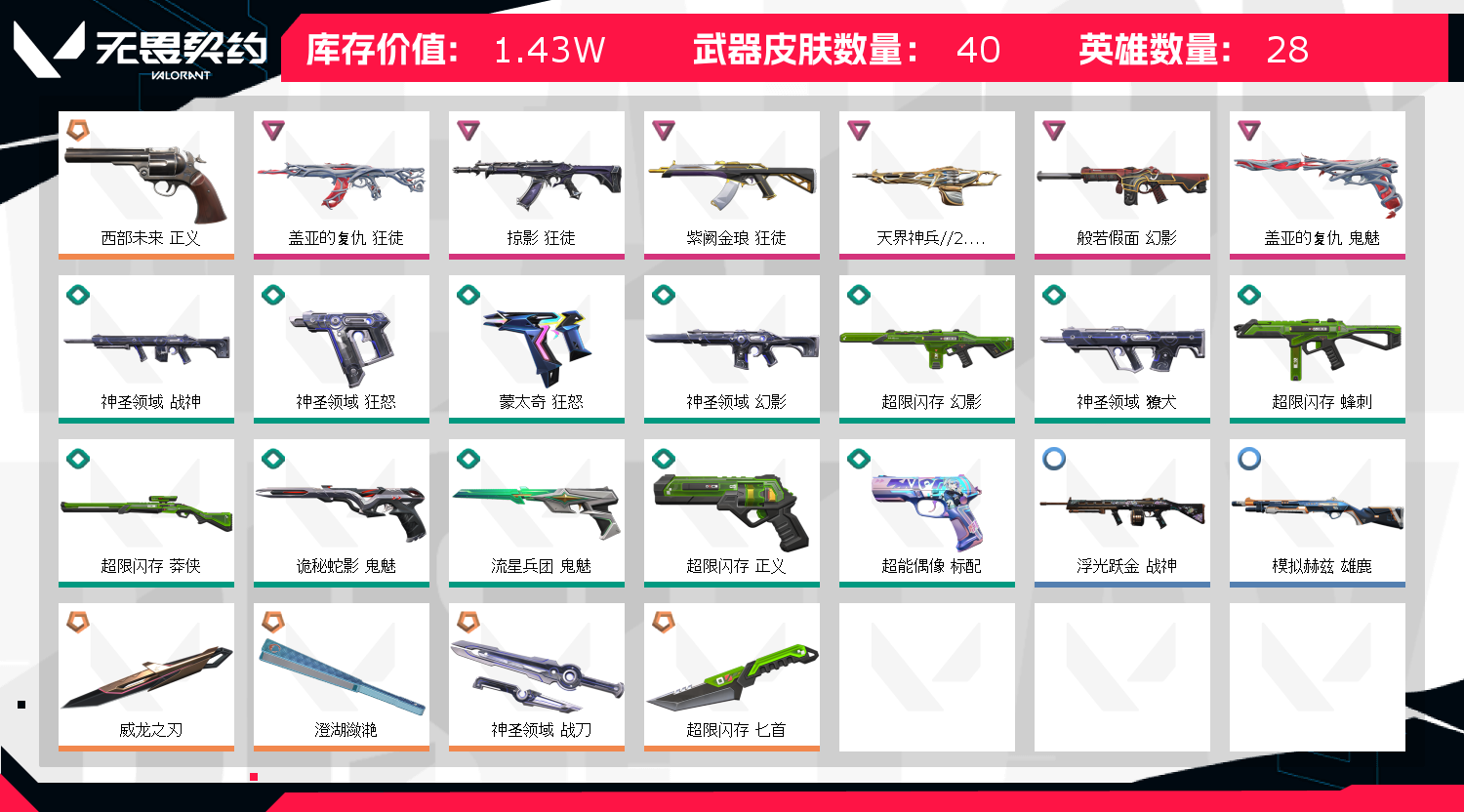 允许 英雄28 武器皮肤数量39;威龙之刃,盖亚的复仇 狂徒,掠影 狂徒,紫阙金琅 狂徒,西部未来 正义,