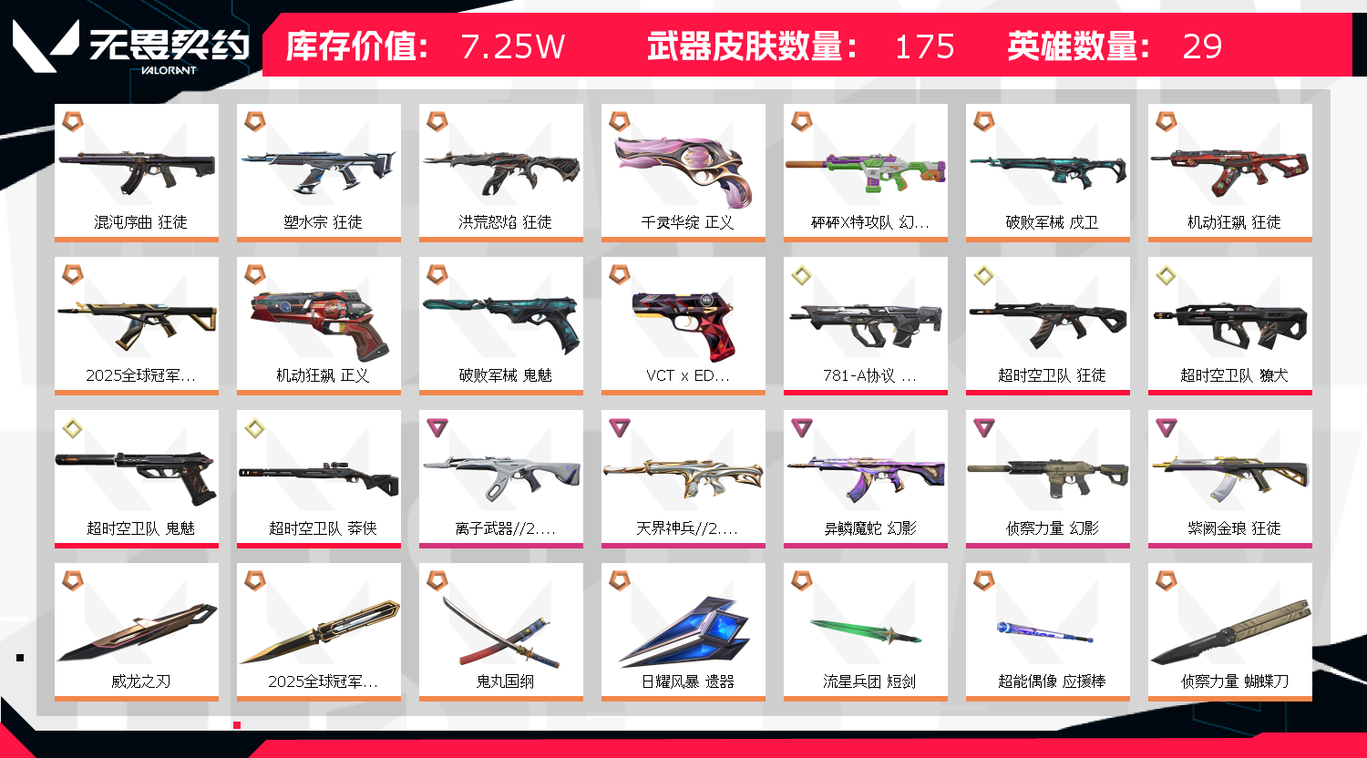 郑重声明: !!!!!因无畏契约检测严格,为防止后台插件导致封号,请务必重启电脑!!!!本人商户多年,所属账号已在派出所备案,若出现 账号封禁/毁号等情况,会马上与平台联系,平台会报警处理!请租客文明游戏,不要开挂或挂机! 1.登陆界面稍等2分钟会上去(自动登录)老板不要着急,一次不行多来几次wegame界面要耐心等2分钟 2.密令会自动输入如果一次不成功多来几次 3..进入wegame后到弹短信验证处,关闭掉,重新下载无畏契约这个游戏即可成功上号,记住。这个方法百分百上号成功!就是进入wegame重新下载无畏契约游戏 !!!百分百成功!! 4.请及时续租不要挂机,到时不下线,但是下一个会挤号导致挂机,所以请及时续租,导致禁赛的一律拉黑 5.祝老板玩的愉快,喜欢可以收藏关注 ! 开挂必追究,不拿到赔偿不罢休! 如果上号正在游戏中,是上个租客到时不下线导致的,不是号主在玩,请帮忙打完这局, 谢谢了,为了防止顶号,请您及时续租获得更好的游戏体验❤️;威龙之刃,天界神兵//2.0 幻影,洪荒怒焰 狂徒,异鳞魔蛇 幻影,侦察力量 幻影,紫阙金琅 狂徒,天界神兵 戍卫,