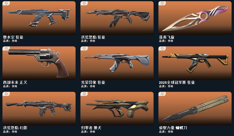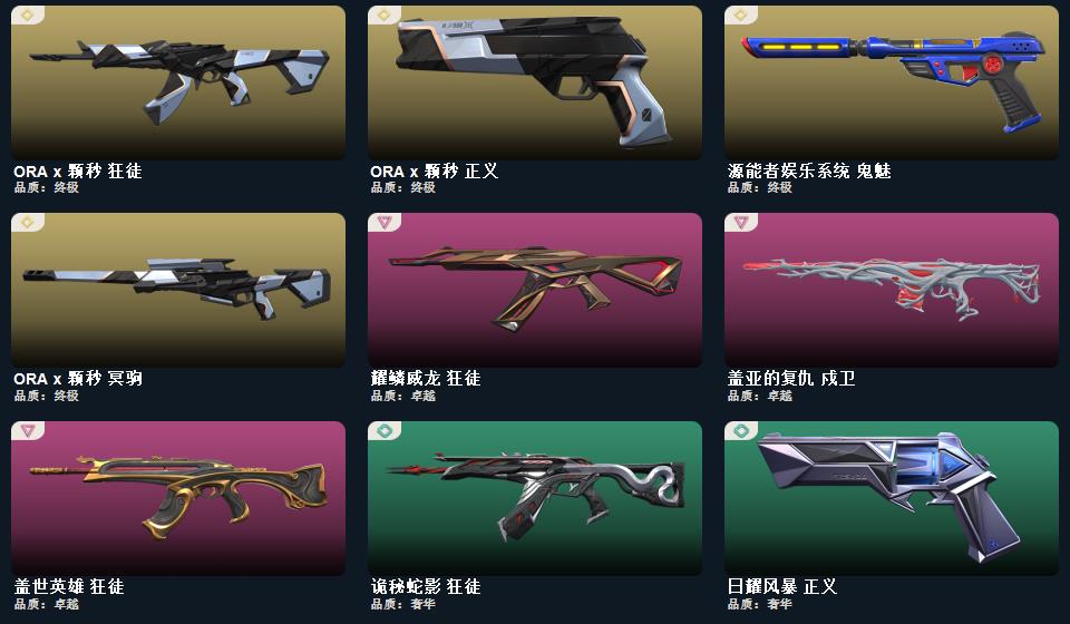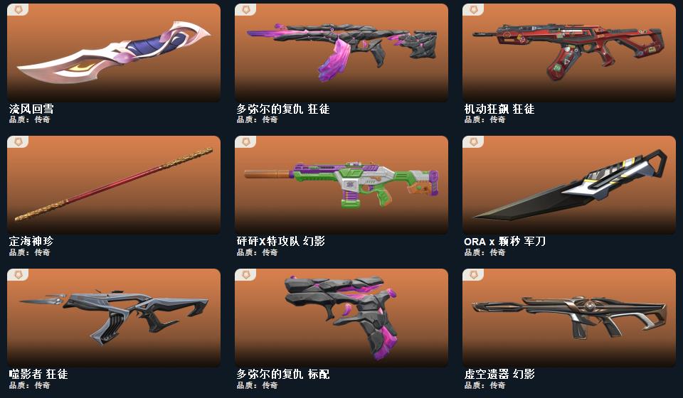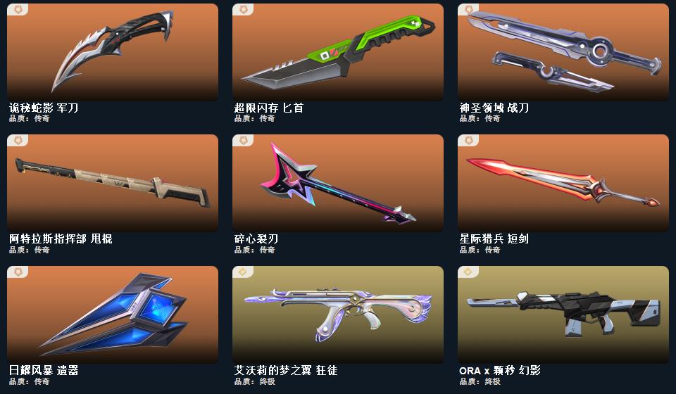 wegame无畏契约★流风回雪,碎心裂刃,ORA x 颗秒 军刀,星际猎兵 短剑,定海神珍,阿特拉斯指挥部 甩棍,落英飞旋,日耀风暴 遗器,诡秘蛇影 军刀,侦察力量 蝴蝶刀,幻心猎手 鬼魅,甜心猎手 幻影,诛心猎手 冥驹,诛心猎手 奥丁