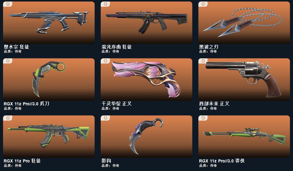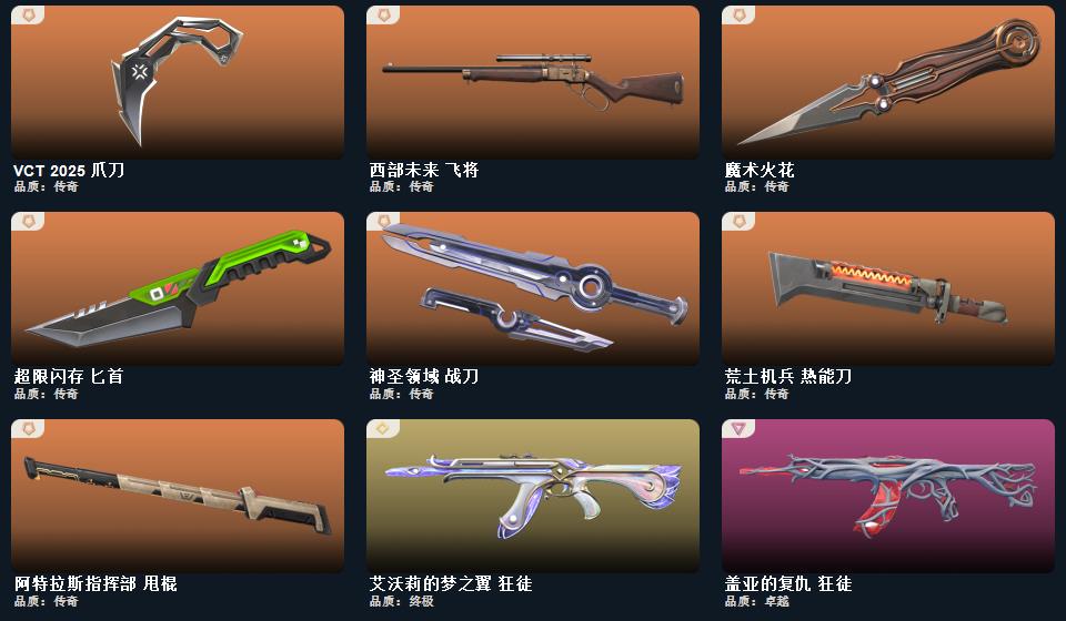 魔术火花,影钩,黑波之刃,神圣领域 战刀,VCT 2025 爪刀,荒土机兵 热能刀,RGX 11z Pro//3.0 爪刀,超限闪存 匕首,幻心猎手 鬼魅,阿特拉斯指挥部 狂徒,RGX 11z Pro//3.0 莽侠,太空穿梭 战神