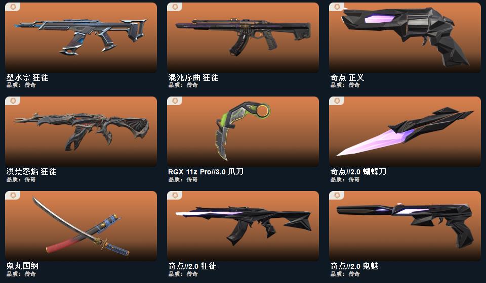 wegame无畏契约★武器皮肤数量:63,生物分子解离器,神圣领域 战刀,荒土机兵 热能刀,鬼丸国纲,侦察力量 蝴蝶刀,夜刃诡镰,幻心猎手 鬼魅,月球哨兵 戍卫,星云暗涌 冥驹,神圣领域 战神