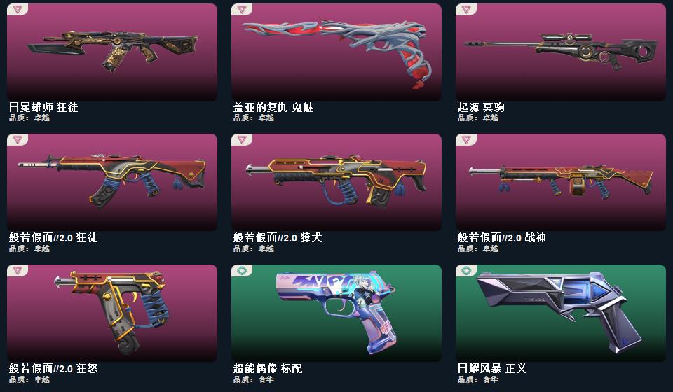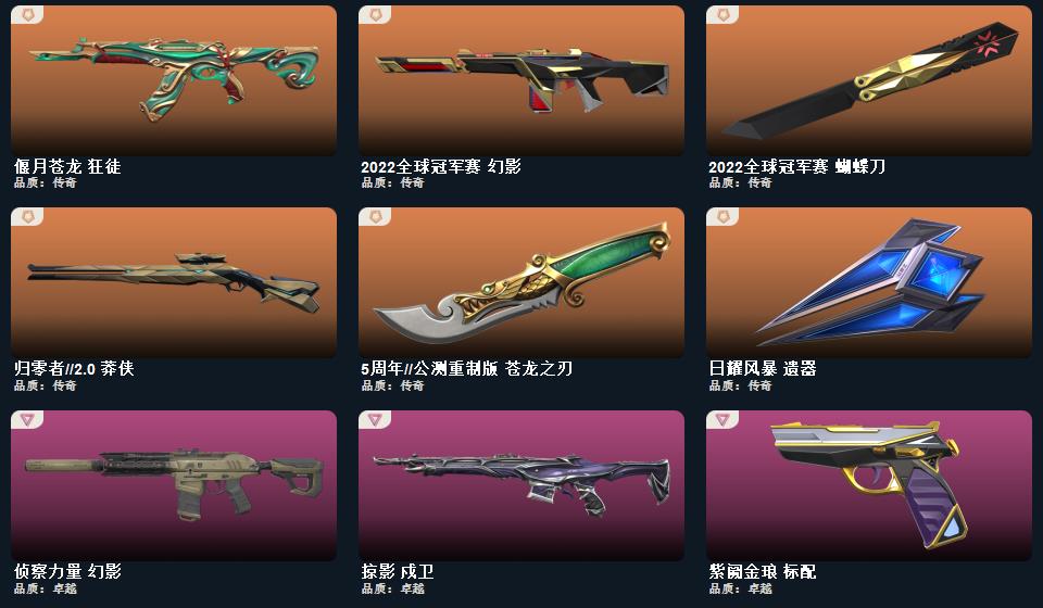 2022全球冠军赛 蝴蝶刀,5周年//公测重制版 苍龙之刃,日耀风暴 遗器,鬼丸国纲,RGX 11z Pro//3.0 爪刀,澄湖潋滟,星际猎兵 标配,2025全球冠军赛 狂徒,归零者//2.0 莽侠,日耀风暴 奥丁